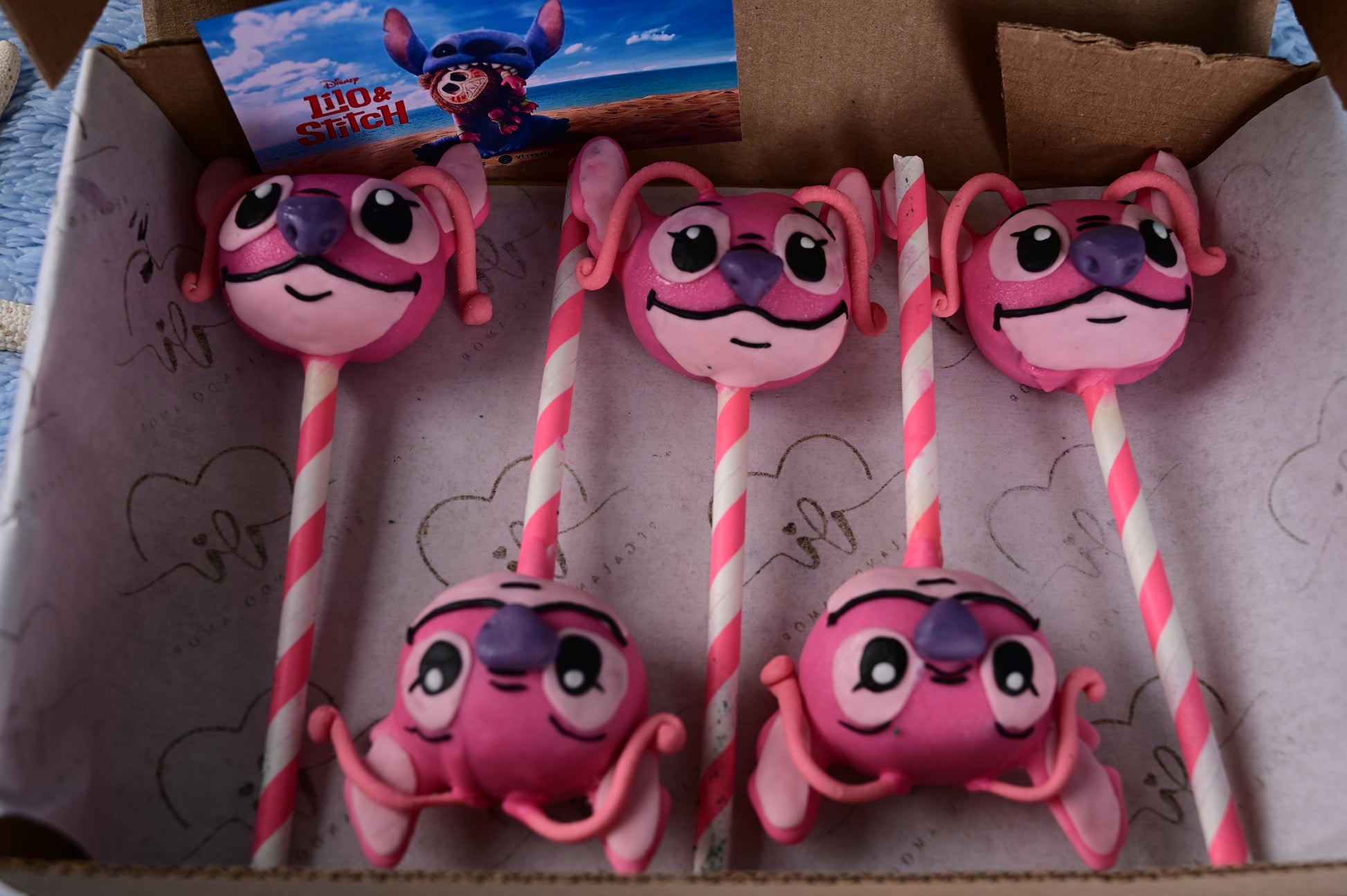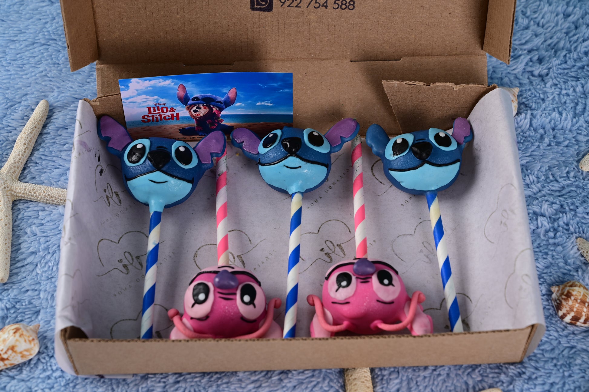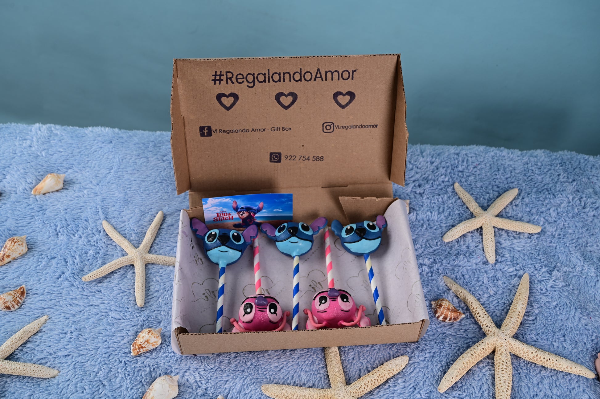 Un detalle fuera de este mundo para conquistar con dulzura. El Box Intergaláctico incluye 5 cake pops de keke esponjoso , bañados en chocolate y decorados con diseños temáticos de Stitch y Angel , la pareja más adorable del universo Disney.