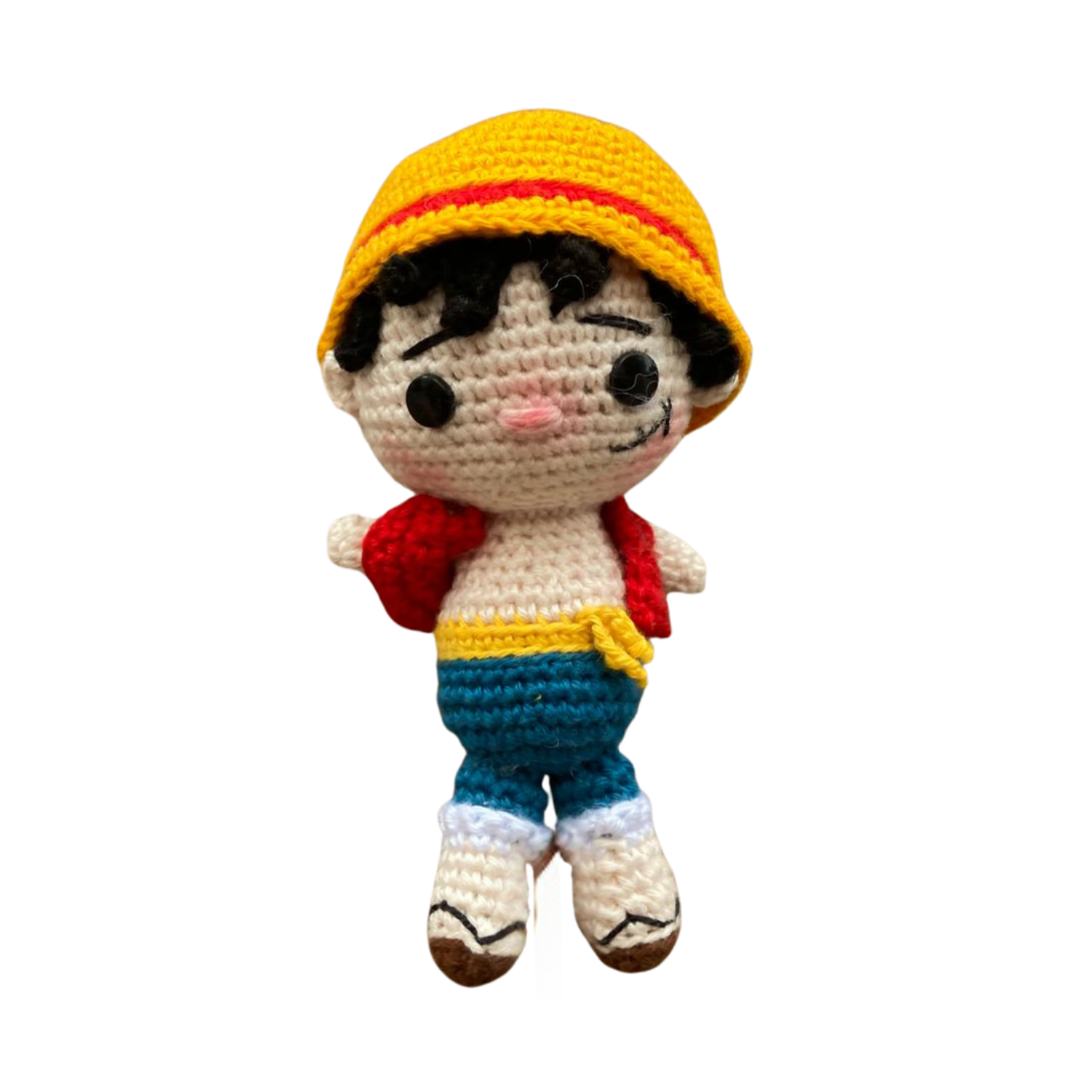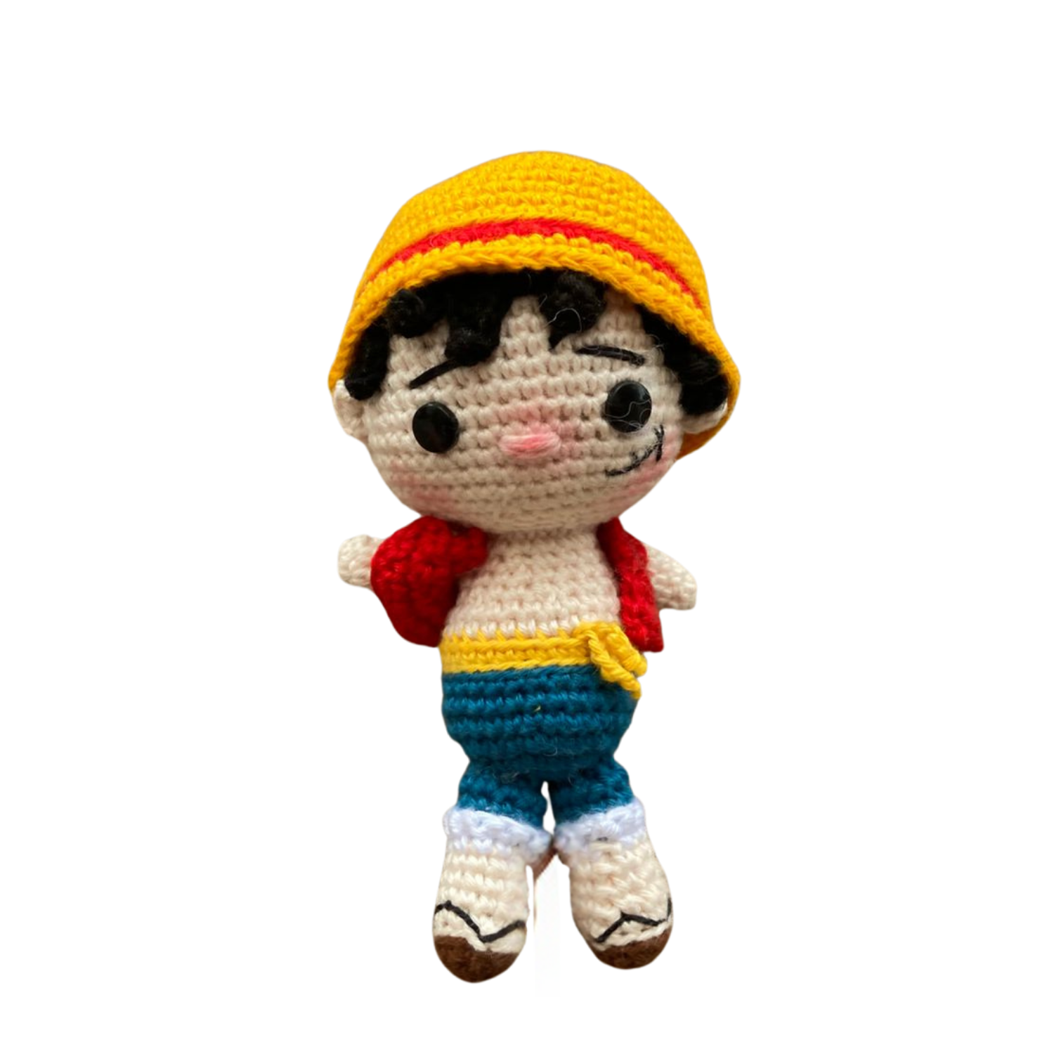 Un adorable amigurumi tejido a mano inspirado en Luffy, el protagonista de One Piece.
