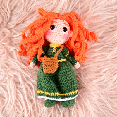 Lleva la magia de Valiente a casa con nuestra princesa Mérida en versión grande, elaborada a mano con algodón 100 % hipoalergénico. Sus rizos característicos, su vestido azul oscuro y su arco detallado reflejan la fuerza y valentía de esta heroína. Ideal como regalo para fanáticos de Disney o como pieza de colección.