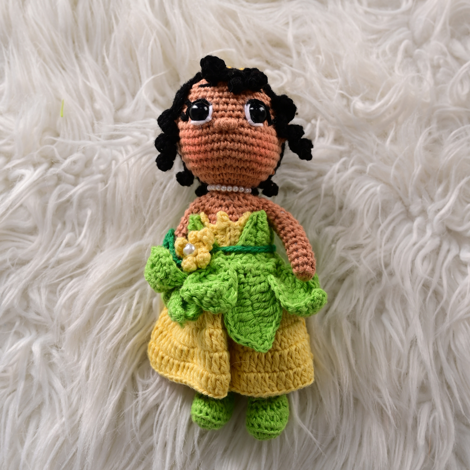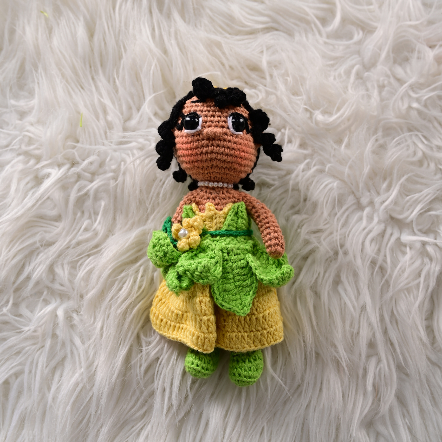 Inspirado en La Princesa y el Sapo, este amigurumi hecho a mano representa a Tiana con su característico vestido verde. Elaborado con hilo 100% algodón hipoalergénico, es suave, seguro y duradero. Perfecto como detalle especial o acompañamiento en arreglos florales.