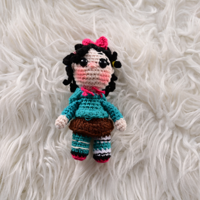 Mini amigurumi de Vanellope, tejido a mano con algodón 100 % hipoalergénico. Incluye su icónico moño, sudadera verde y detalles coloridos que la hacen especial. Perfecta para acompañar un regalo, añadir a una colección o decorar de forma creativa.