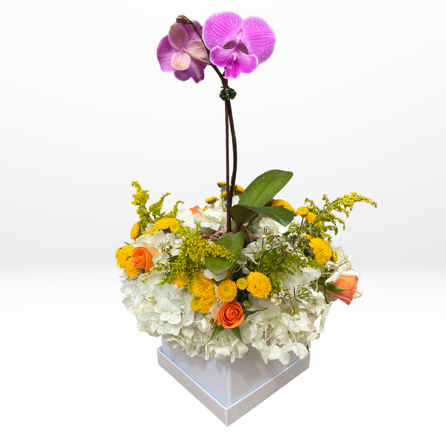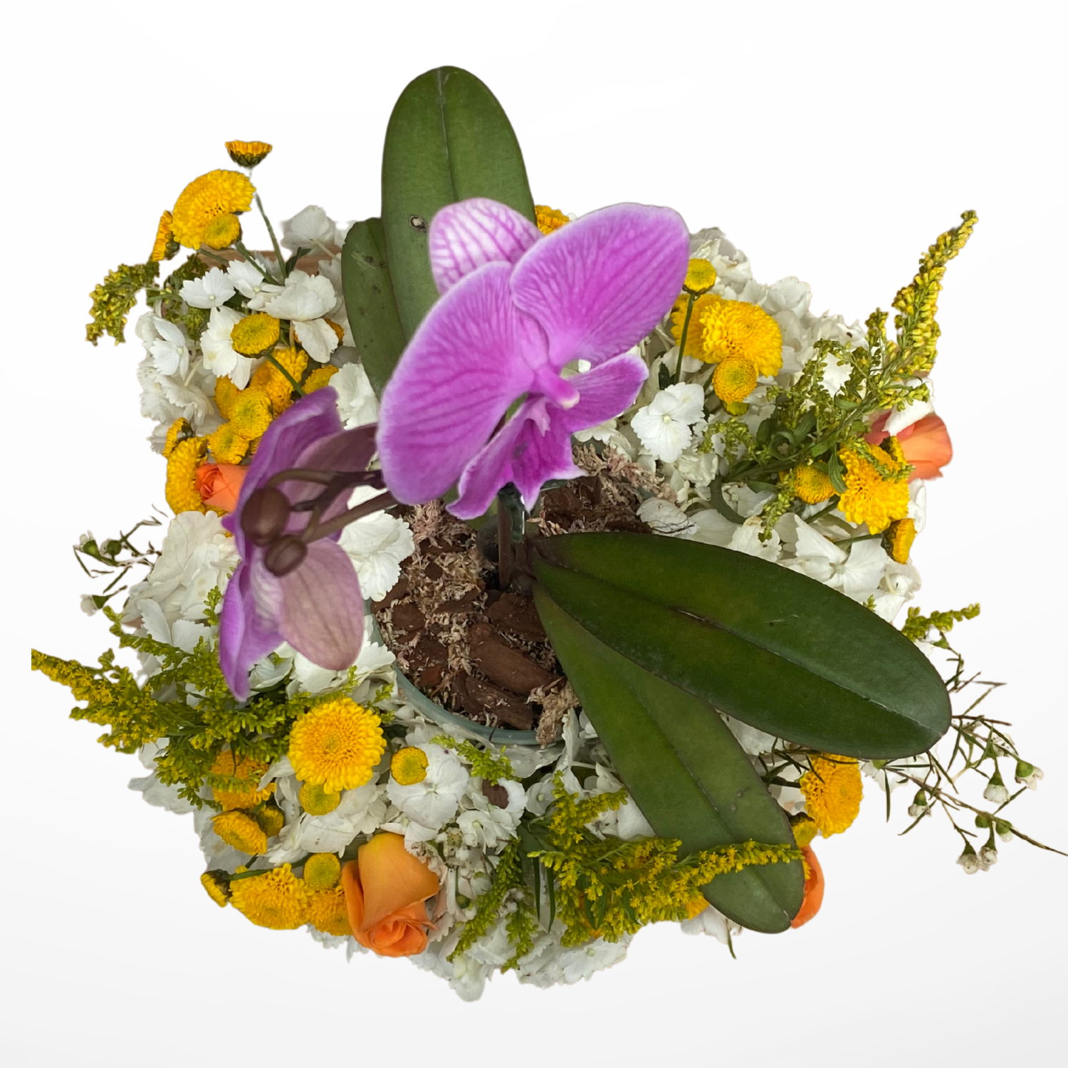 Un arreglo sofisticado que combina flores frescas en tonos amarillos con una mini planta de orquídea, cuyo color puede variar según disponibilidad. Su diseño alegre y primaveral lo convierte en un detalle único para decorar o regalar con estilo.