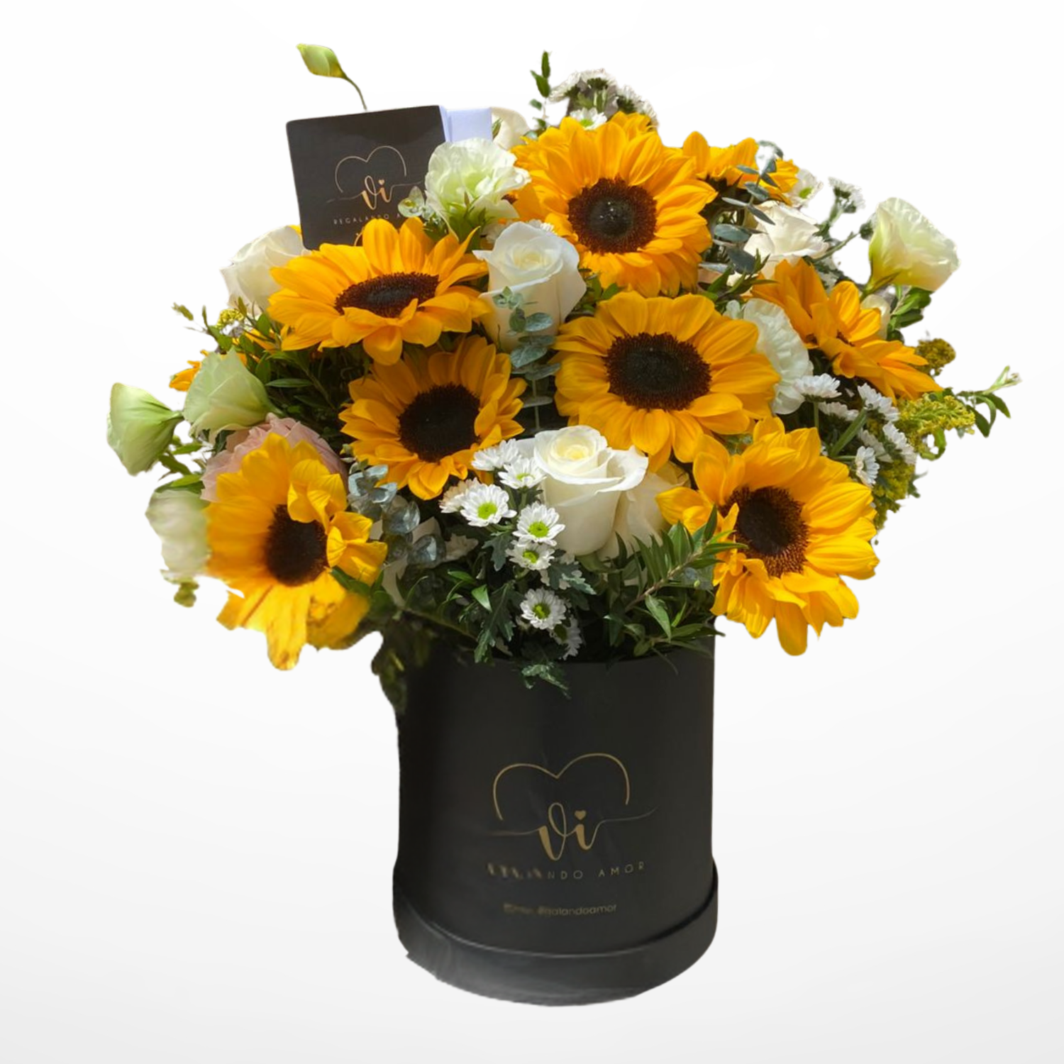 El Box Adriana es un arreglo floral grande de una sola cara, diseñado para transmitir alegría y luz. Incluye 10 girasoles amarillos que simbolizan energía y optimismo, junto a 10 rosas blancas que aportan pureza y elegancia. Se complementa con lisianthus y variedad floral que realzan la armonía del diseño en un box amplio.