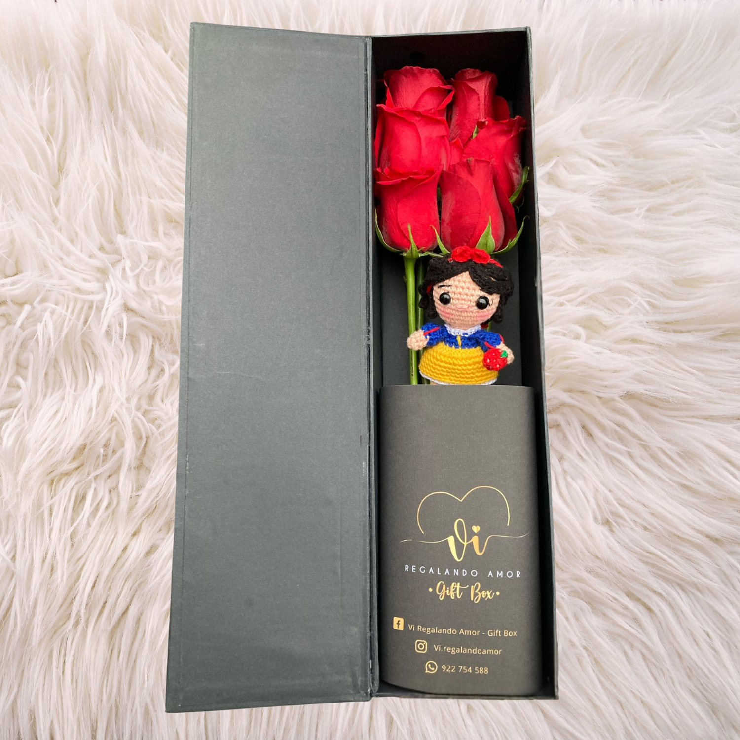 Un regalo digno de un cuento de hadas. El Box Luxury Rosas deslumbra con la elegancia de 6 rosas rojas, símbolo del amor y la pasión, acompañadas por un adorable mini amigurumi de Blanca Nieves que le da un toque mágico y encantador.