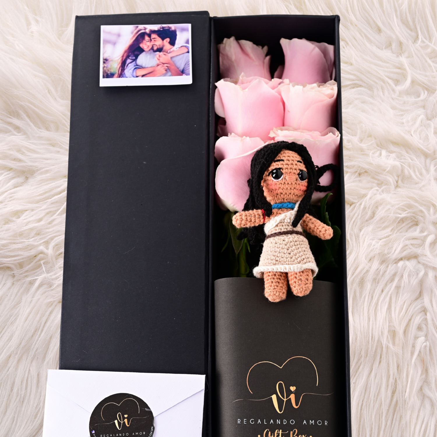 Un diseño sofisticado con 6 rosas Pink Mundial, símbolo de dulzura y elegancia, presentadas en un box exclusivo que realza su encanto natural. Incluye un amigurumi inspirado en Pocahontas, que aporta un toque artesanal y lleno de significado. Ideal para expresar amor, conexión y libertad.
