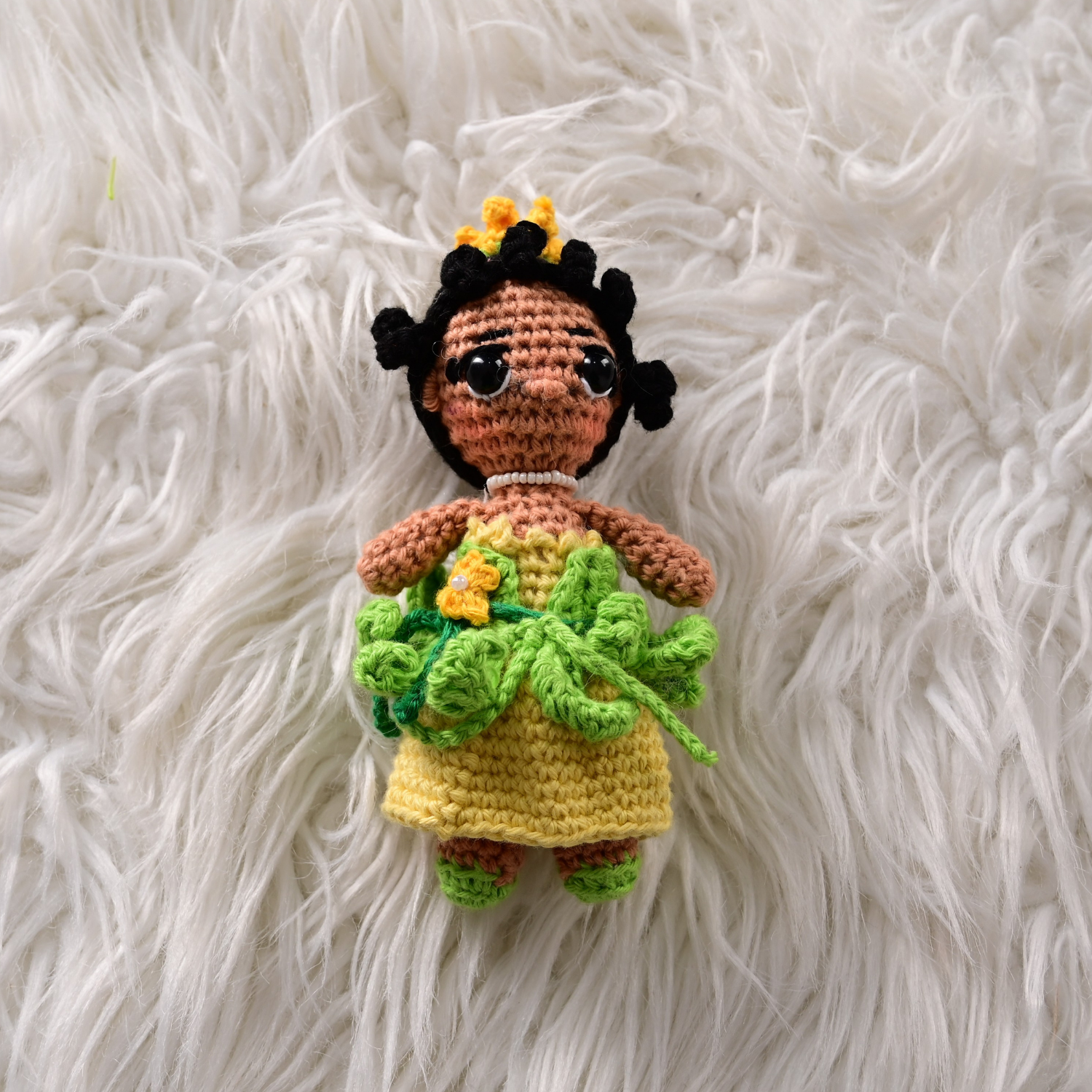 Amigurumi Tiana: 13 cm alto x 6.5 cm ancho x 4 cm largo