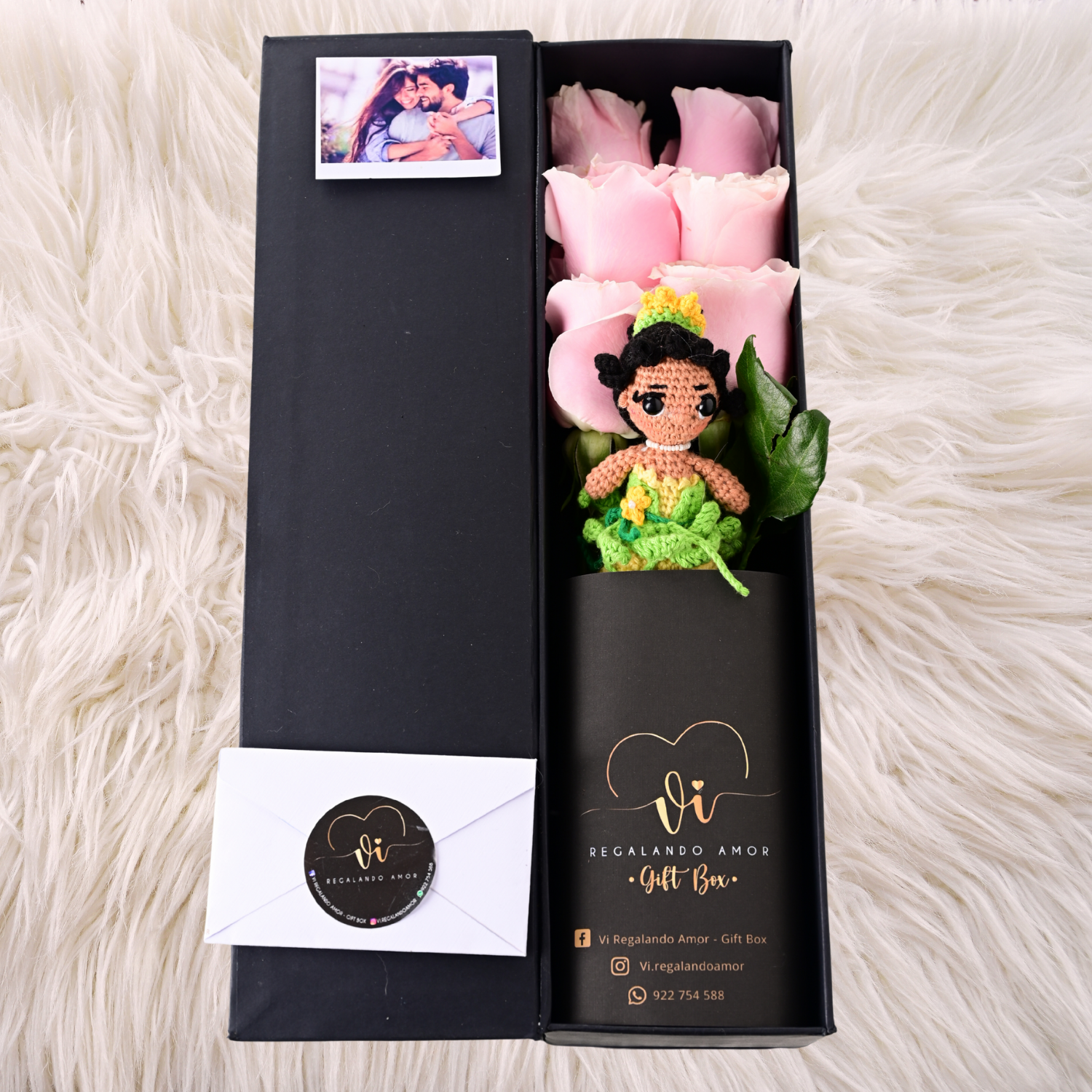 Un box elegante con 6 rosas Pink Mundial, cuidadosamente seleccionadas por su belleza y frescura. Incluye un amigurumi inspirado en Tiana, que representa perseverancia y elegancia. Perfecto para sorprender con un detalle único y lleno de estilo.