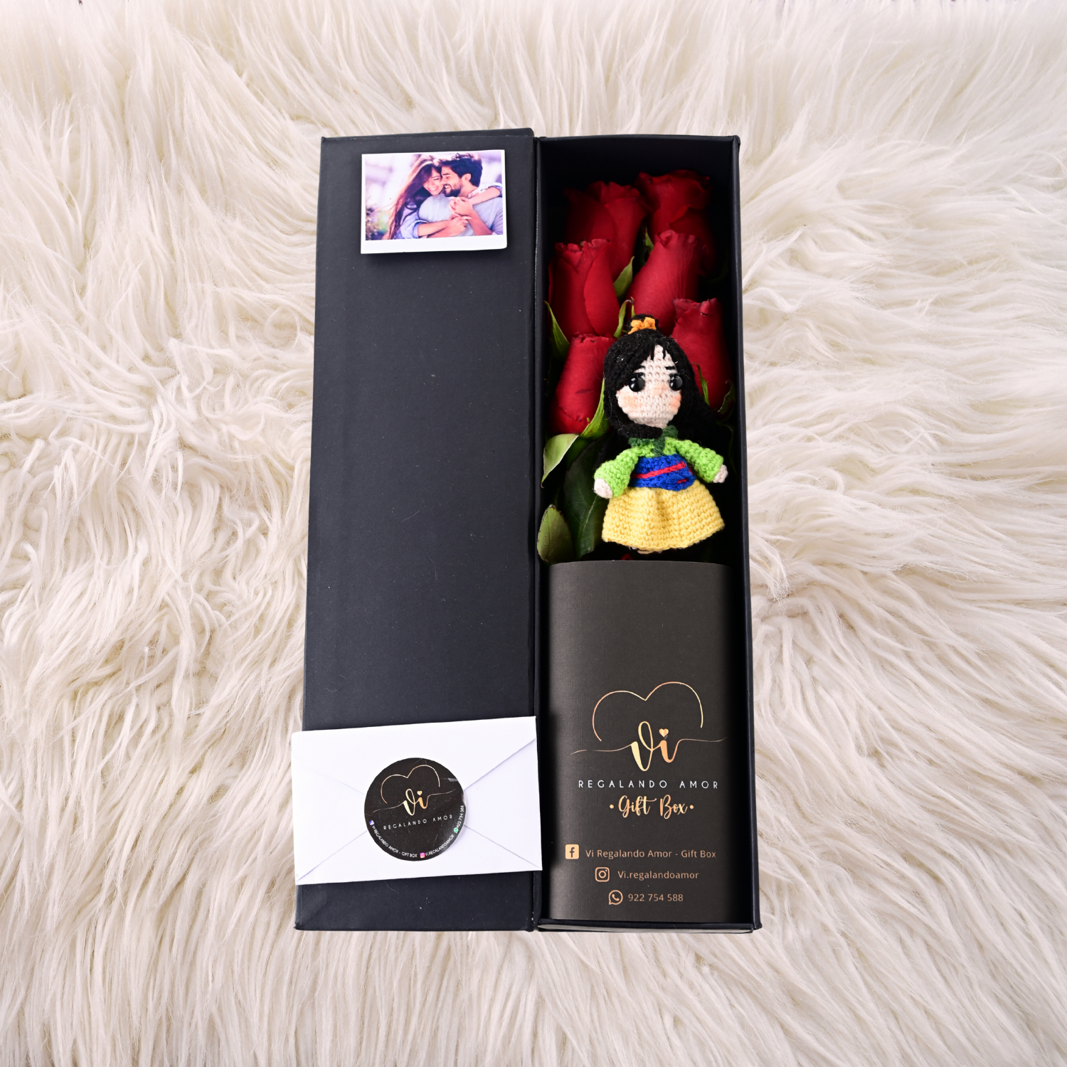 Un diseño imponente con 6 rosas rojas, símbolo de amor y pasión, presentadas en un elegante box. Incluye un amigurumi inspirado en Mulán, que representa fuerza y valentía.