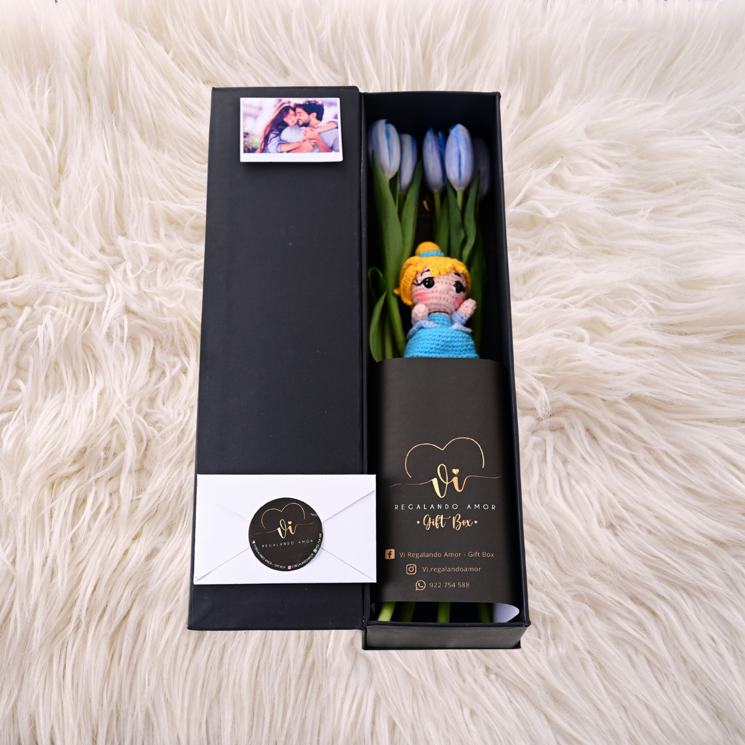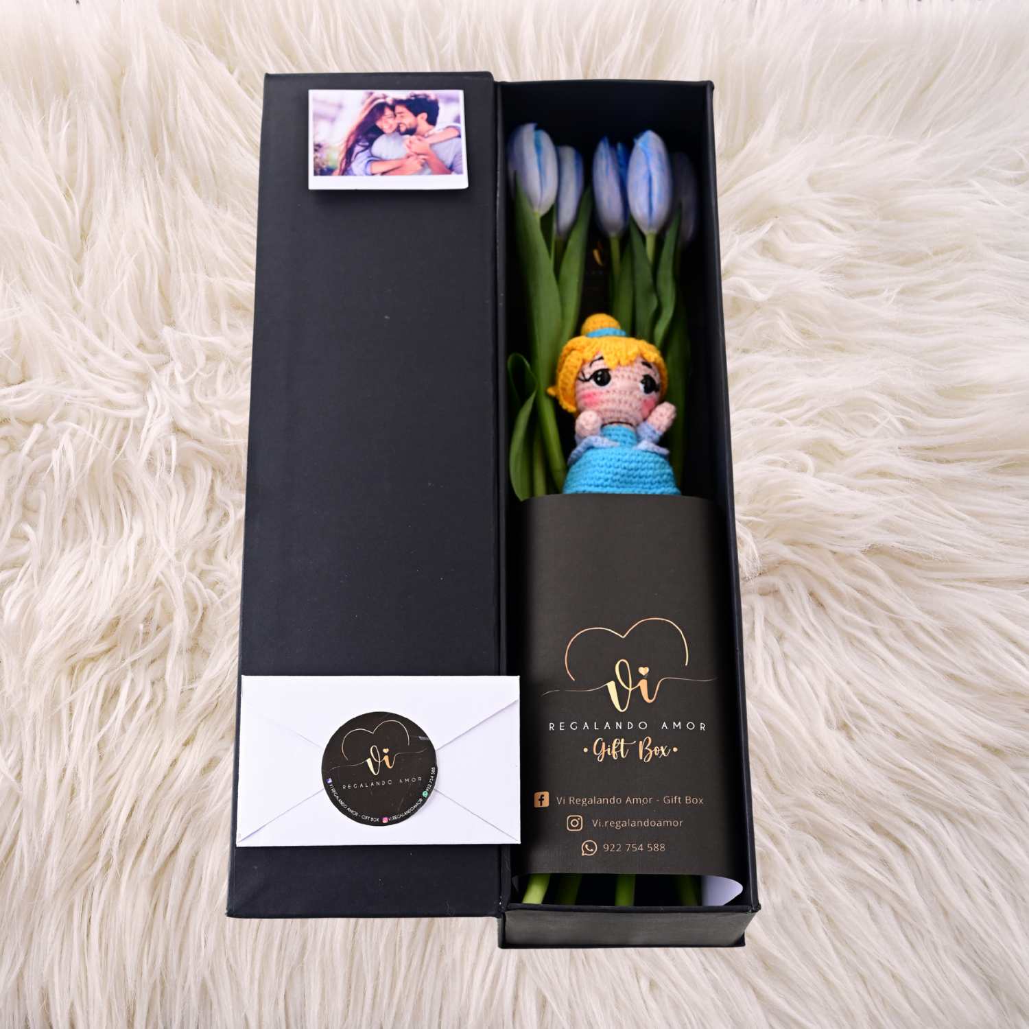 Un detalle mágico con 6 tulipanes celestes pigmentados, que evocan pureza y encanto, presentados en un box elegante. Incluye un amigurumi inspirado en Cenicienta, símbolo de sueños y transformación.