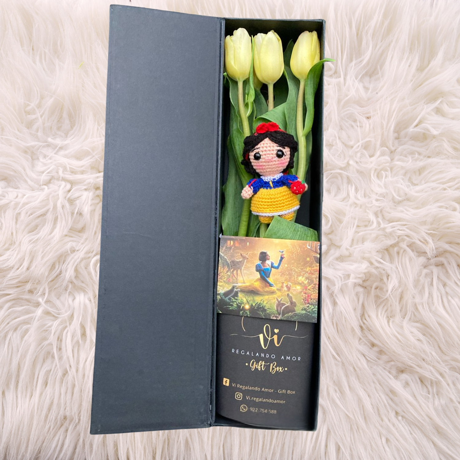 Un detalle lleno de encanto y magia. El Box Luxury Tulipanes resplandece con la belleza de 6 tulipanes amarillos, símbolo de alegría y energía, acompañados de un adorable mini amigurumi de Blanca Nieves, que añade un toque de fantasía y dulzura.