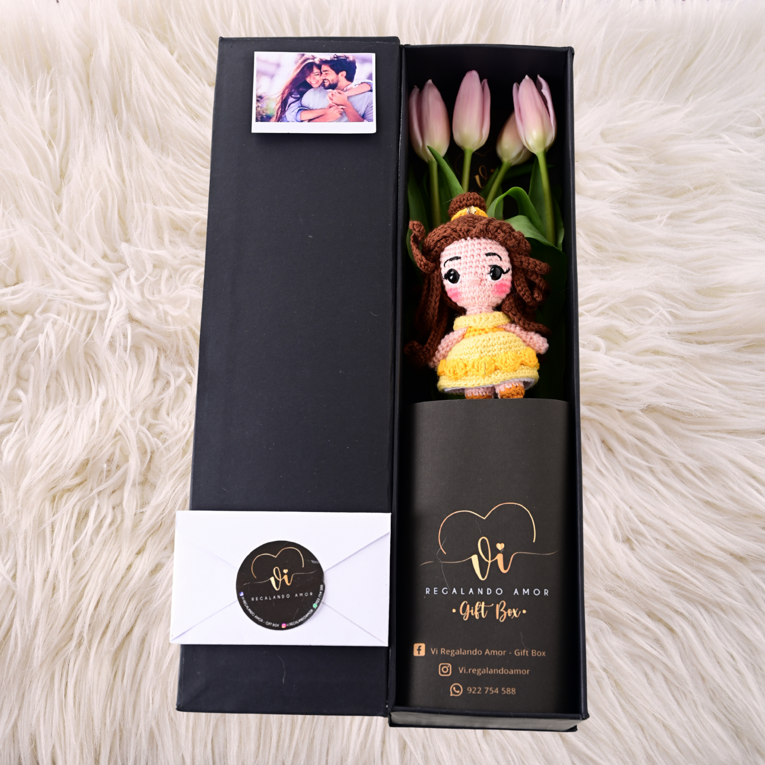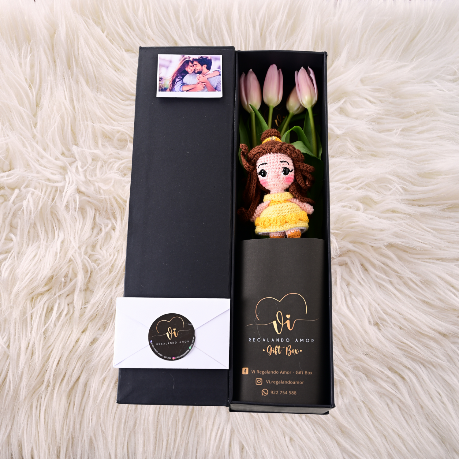 Un detalle romántico con 6 tulipanes rosados, símbolo de ternura y amor, presentados en un box elegante. Incluye un amigurumi inspirado en Bella, que representa amor verdadero y nobleza.