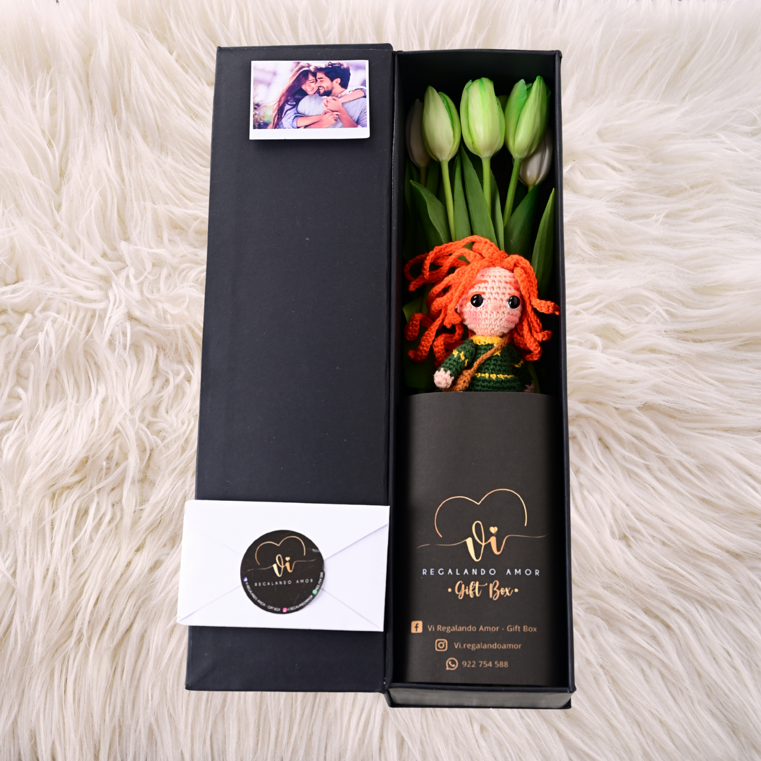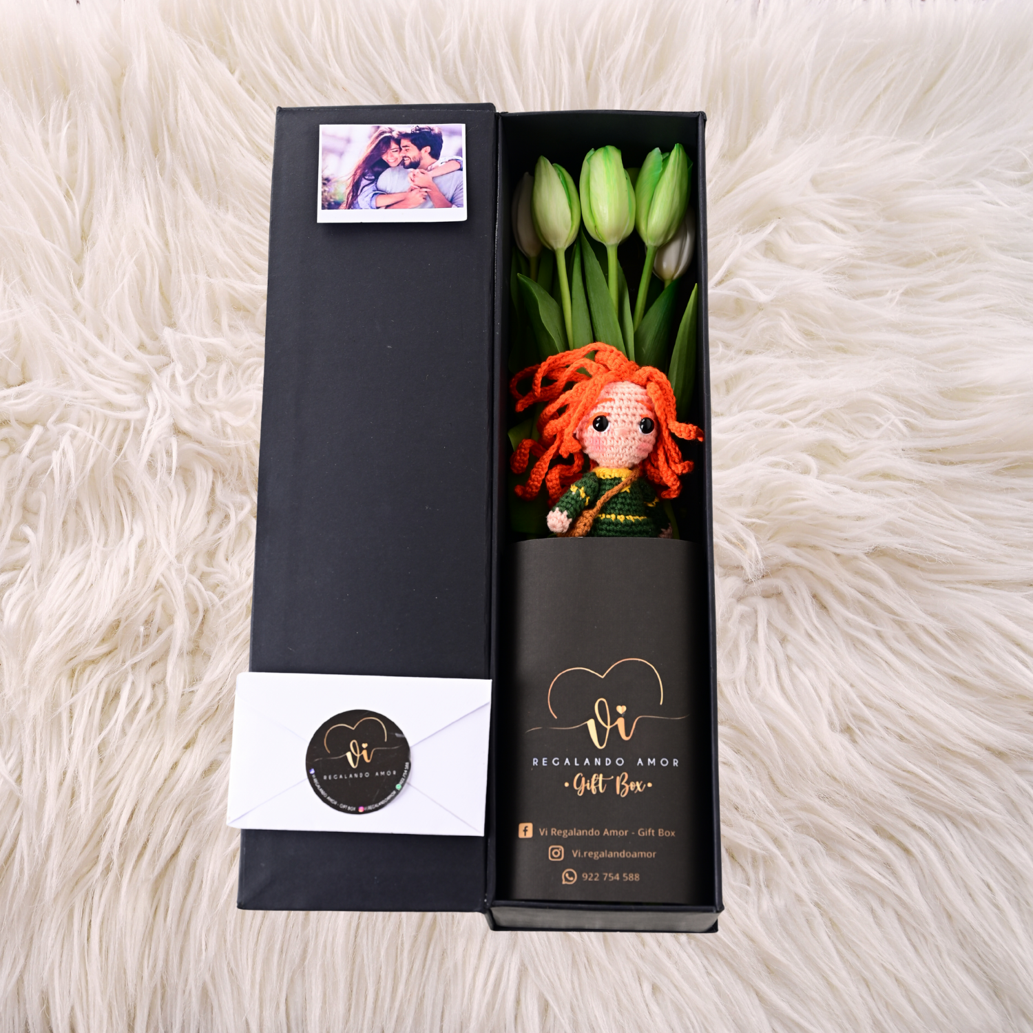 Un arreglo único con 6 tulipanes verdes pigmentados, símbolo de esperanza y renovación, presentados en un elegante box. Incluye un amigurumi inspirado en Mérida (Valiente), que refleja coraje y autenticidad.