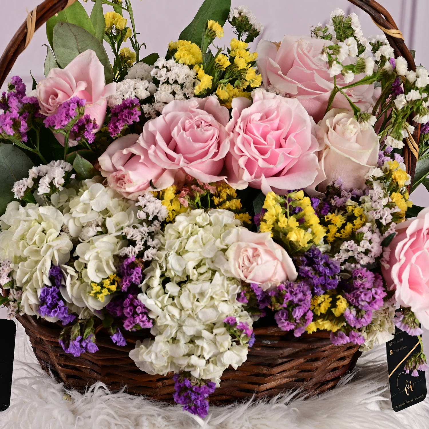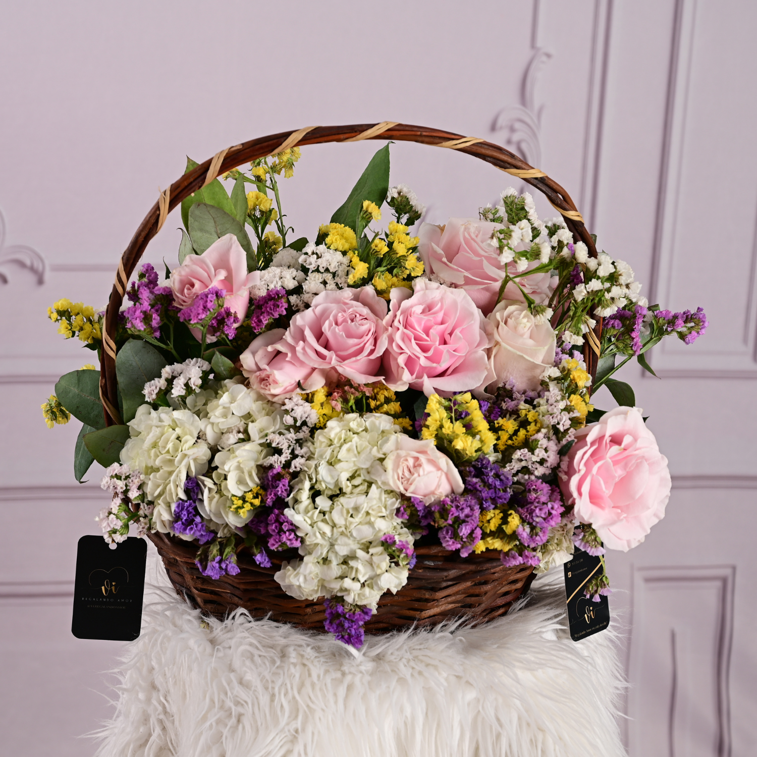 Una canasta elegante y llena de color, con una armoniosa combinación de flores frescas y variadas que evocan la belleza de un jardín natural. Ideal para transmitir alegría, gratitud o cariño en cualquier ocasión especial.