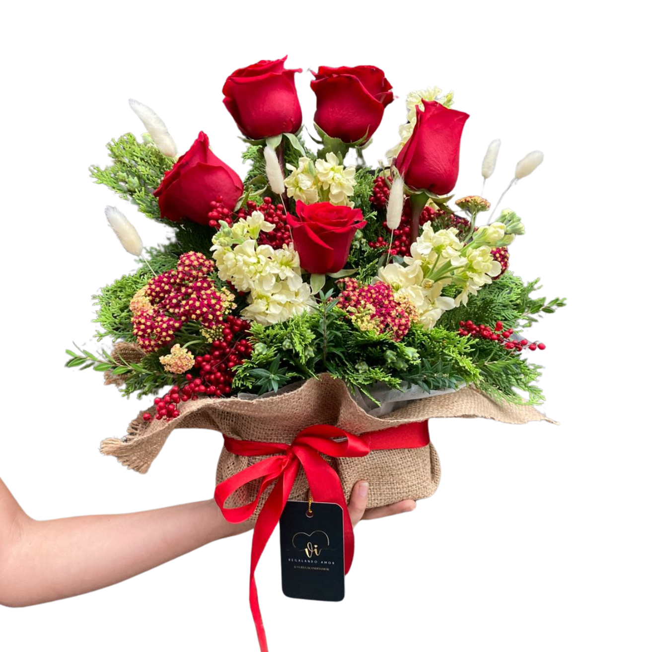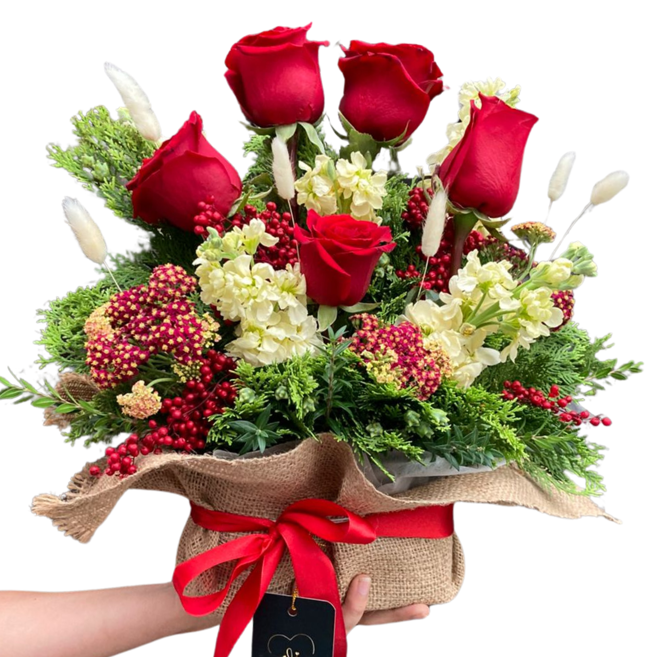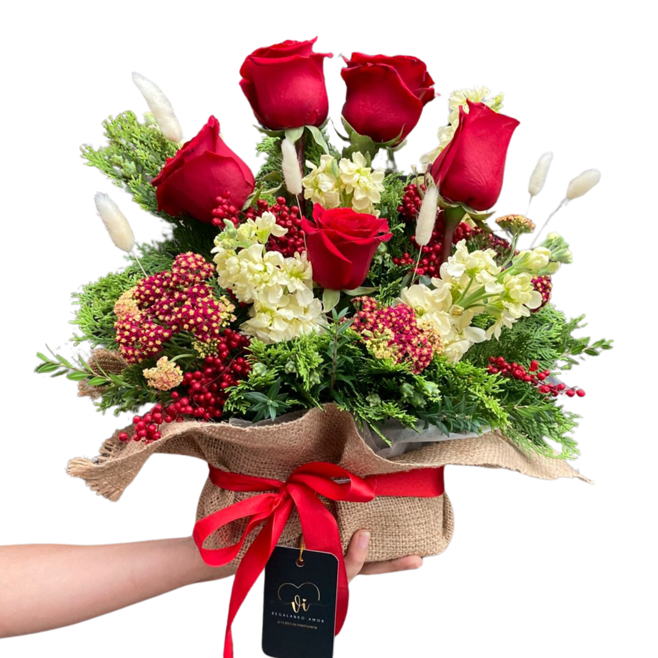 Celebra la temporada con elegancia gracias a nuestro Centro de Mesa Navideño, elaborado con 5 rosas rojas naturales y variedad floral de temporada. Su diseño combina el encanto clásico de la Navidad con un toque moderno, ideal para decorar mesas, escritorios o espacios festivos. Las rosas rojas representan amor y calidez, llenando cualquier ambiente de color, frescura y espíritu navideño.