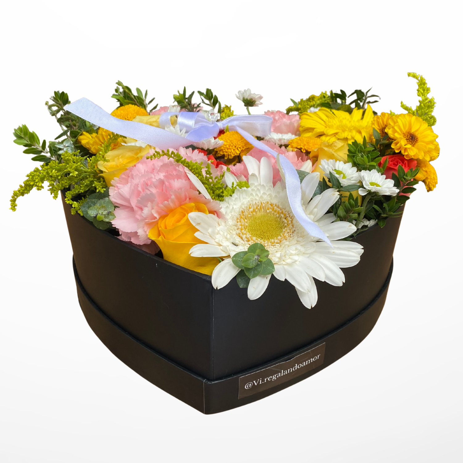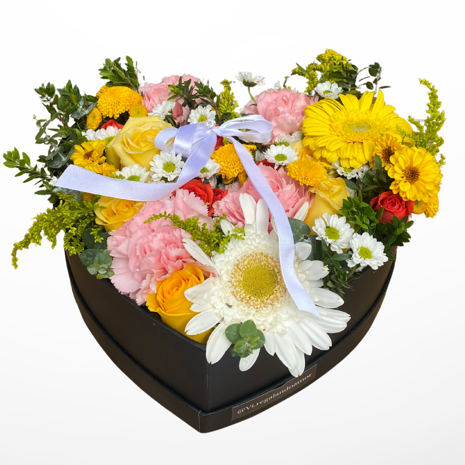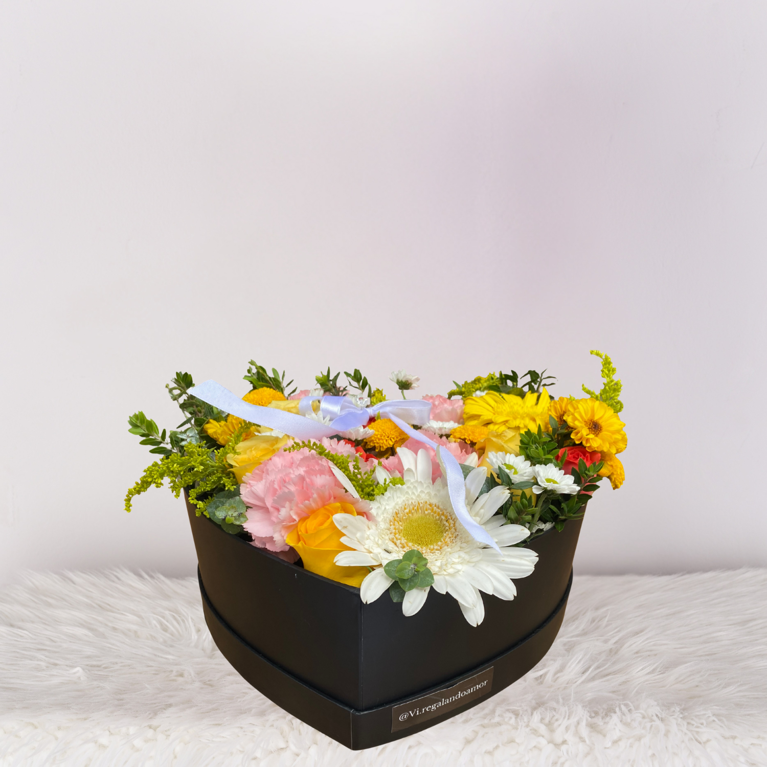 Un diseño en forma de corazón lleno de frescura y color, elaborado con gerberas y rosas acompañadas de variedad floral de temporada. Su estilo primaveral lo convierte en un detalle ideal para sorprender y transmitir alegría en cualquier ocasión especial.