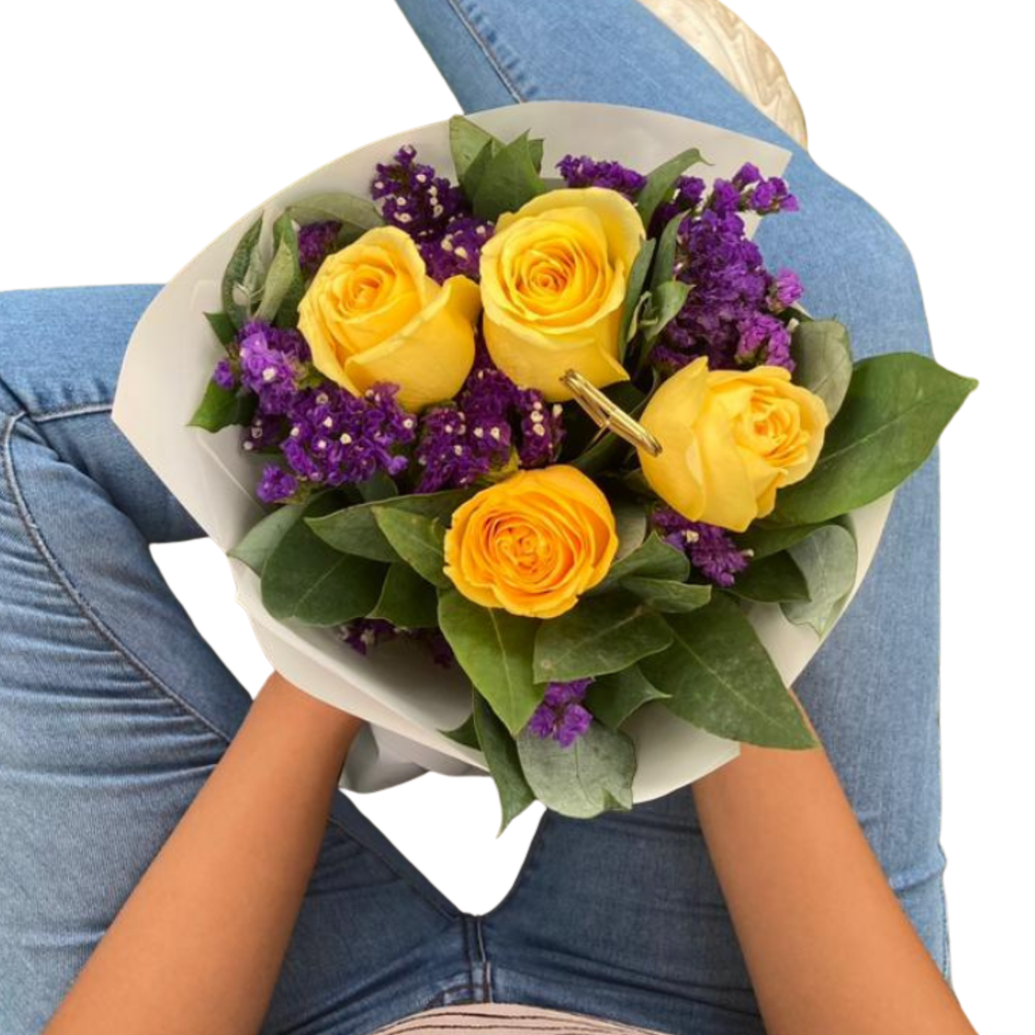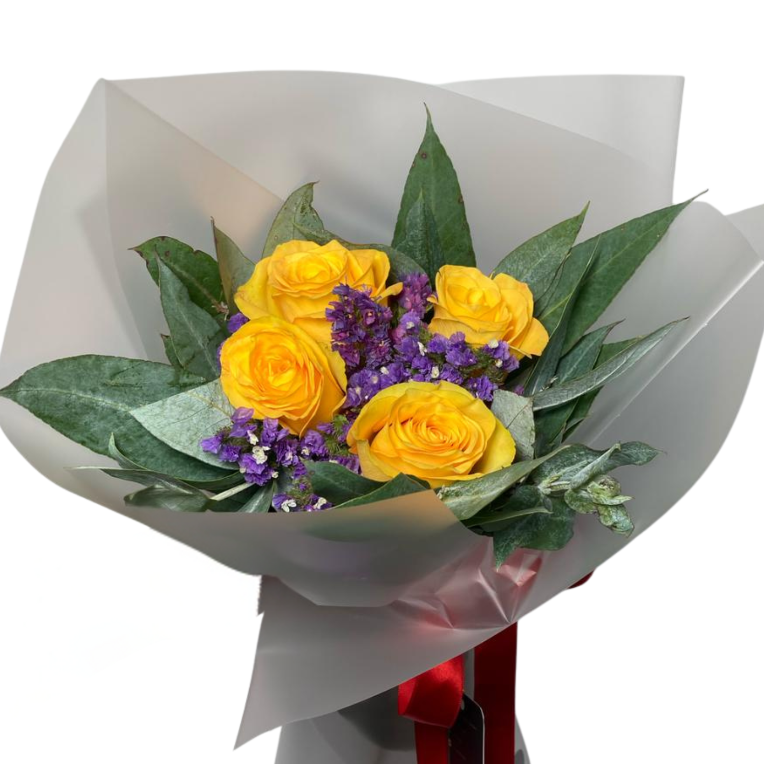 Las rosas amarillas simbolizan amistad, alegría y nuevos comienzos, mientras que el estatis morado añade un toque de elegancia y serenidad.