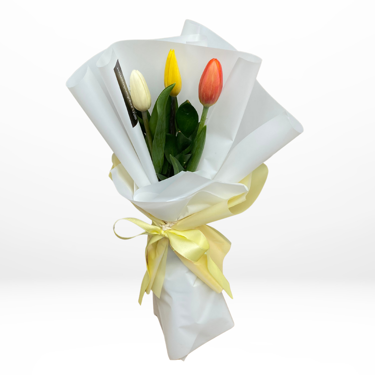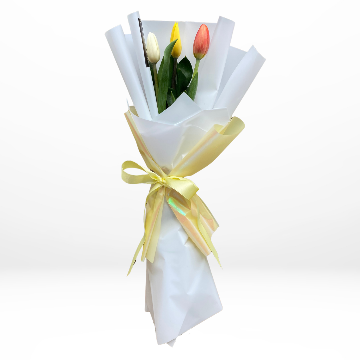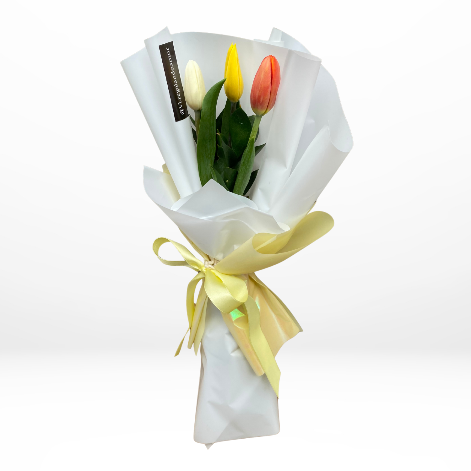 Un mini ramo delicado y fresco con 3 tulipanes en tonos amarillo, naranja y blanco, que evocan la alegría de la temporada primaveral. Acompañado de variedad floral, es un detalle elegante y versátil para sorprender en cualquier ocasión.