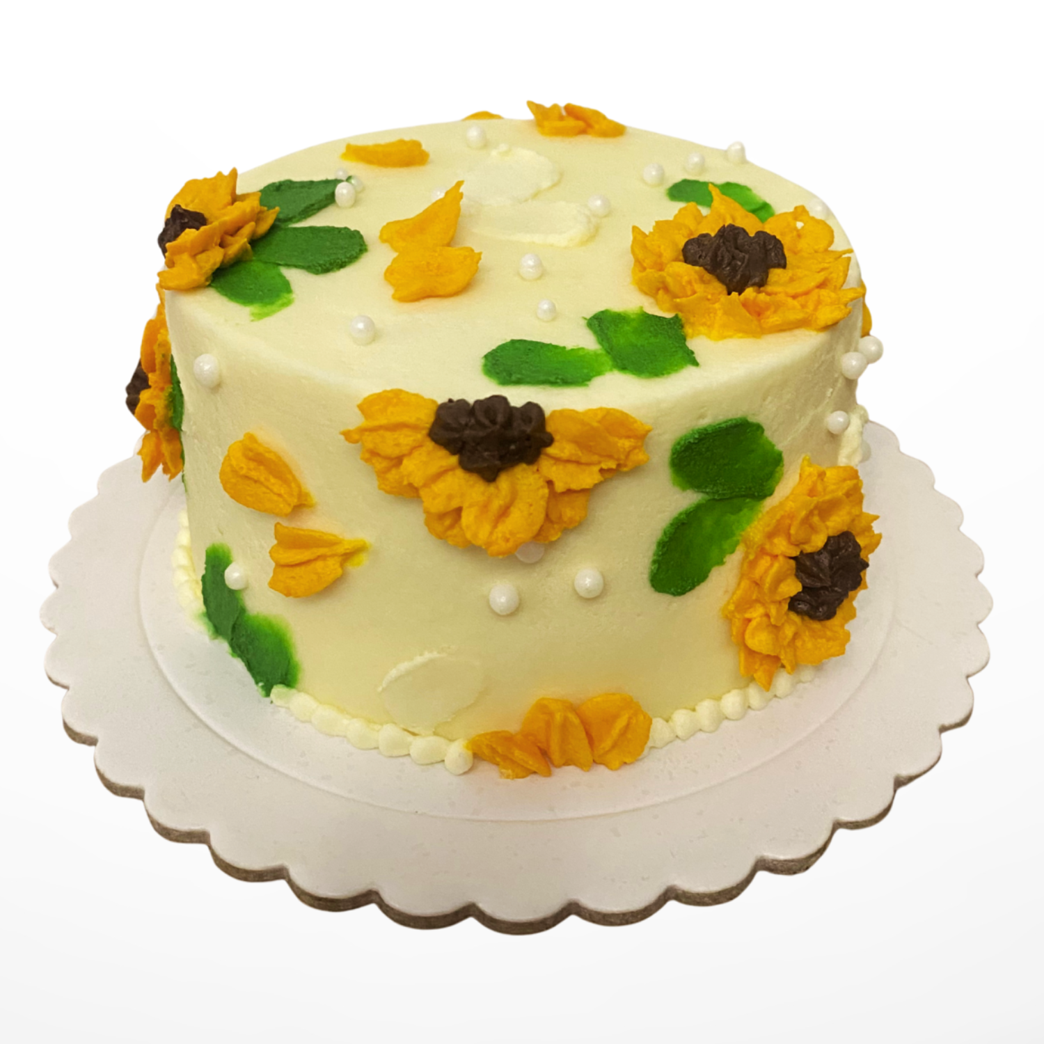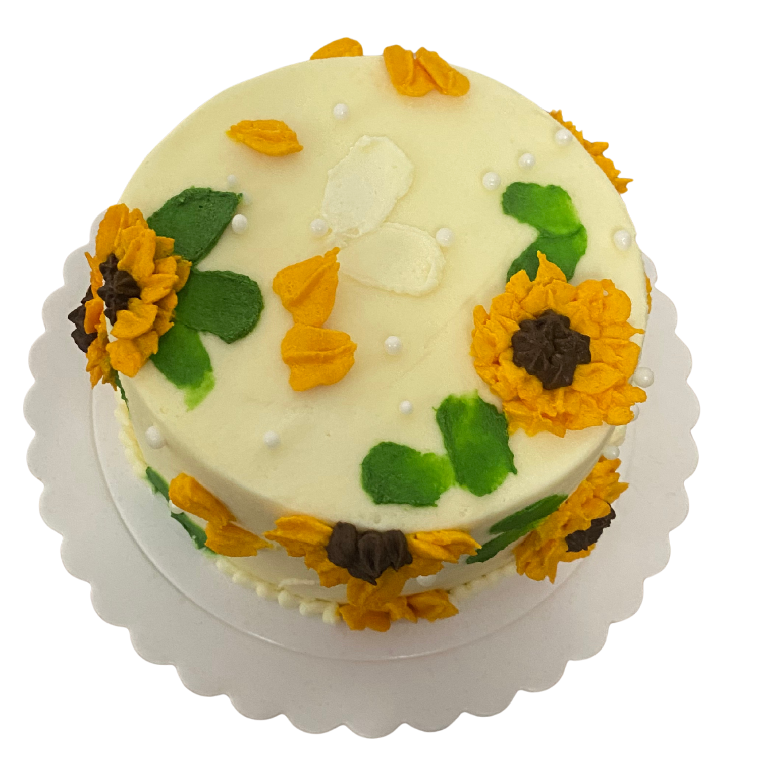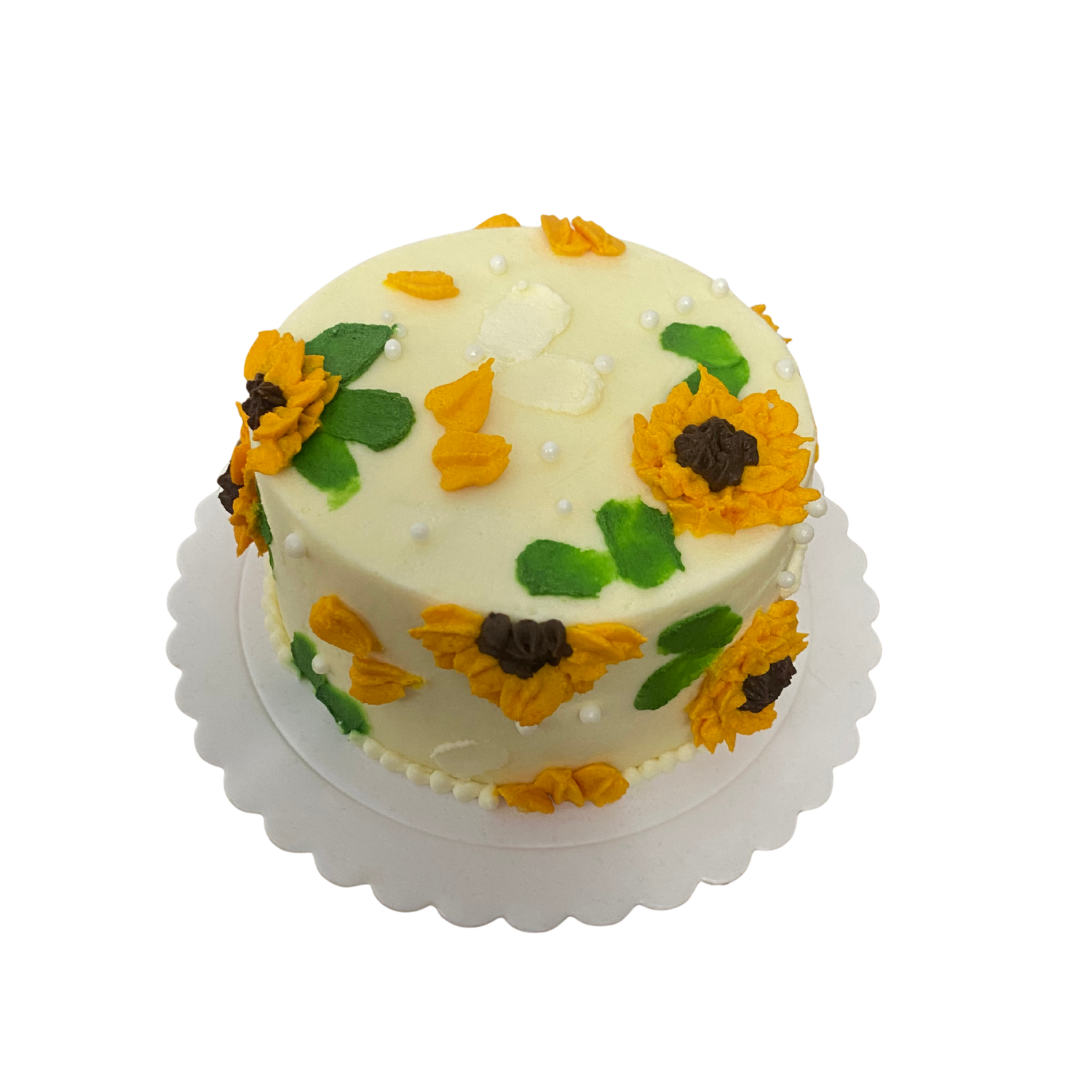Mini torta de chocolate con relleno de manjar blanco, decorada con flores amarillas de diseño primaveral. Perfecta para un detalle dulce y especial.