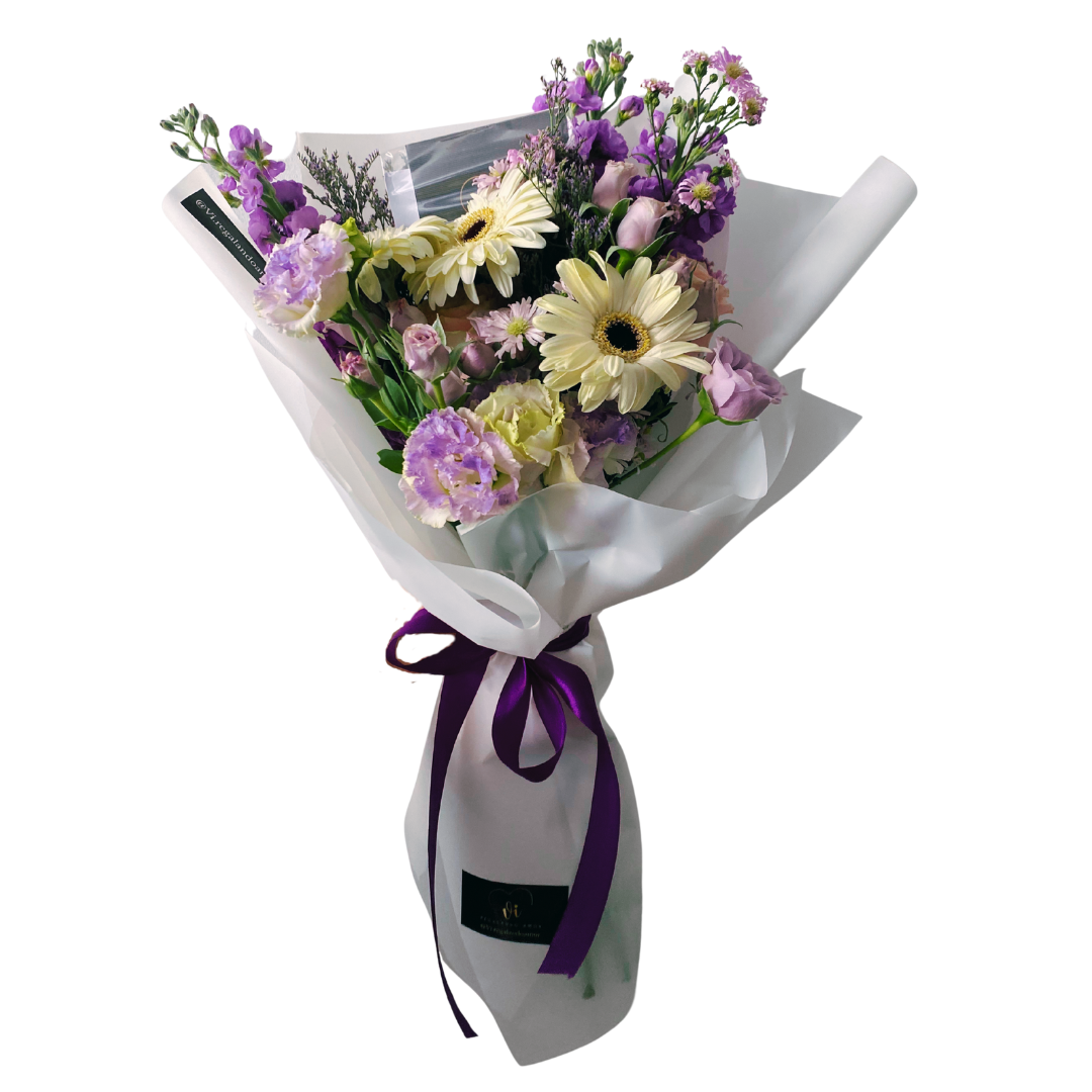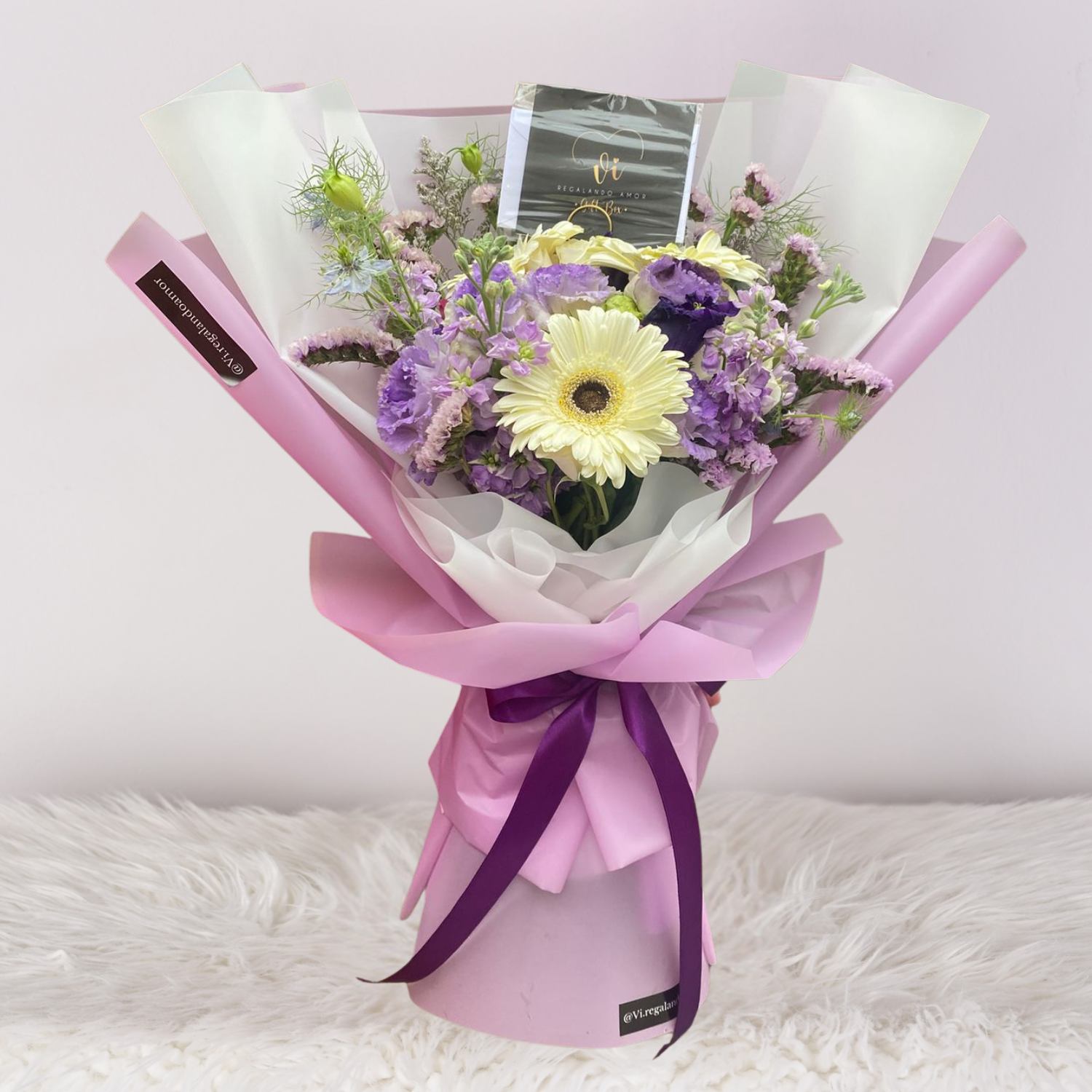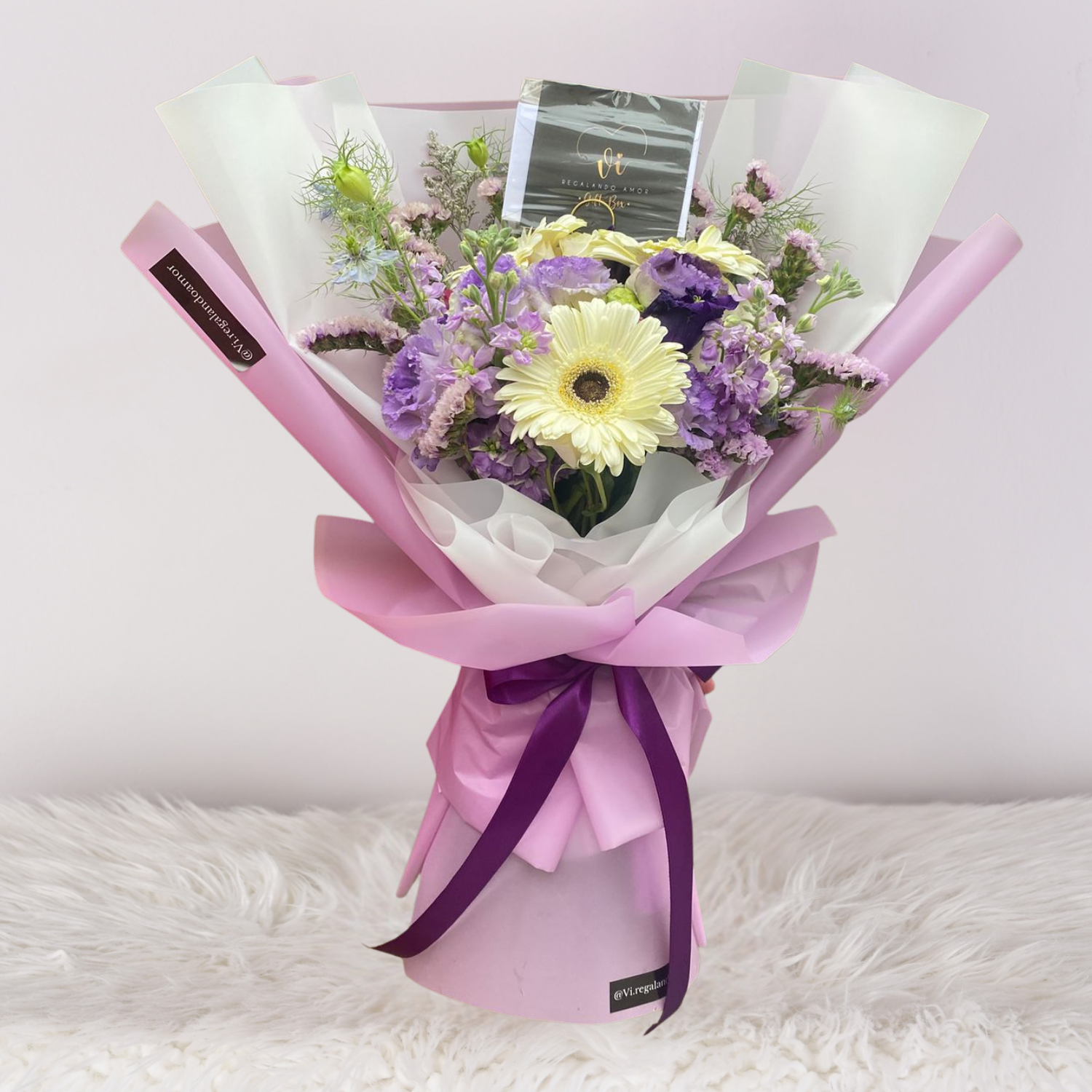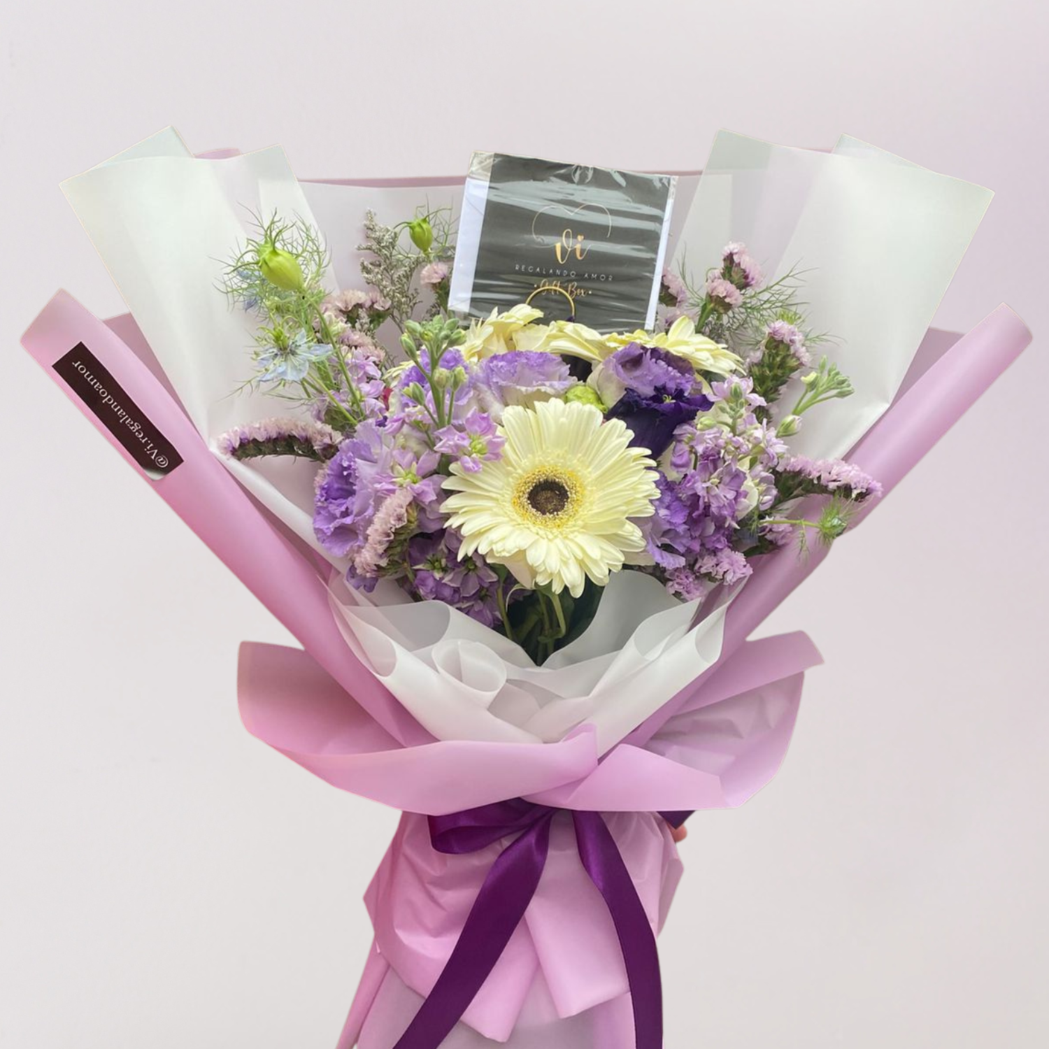 Un ramo elegante y lleno de armonía, elaborado con una delicada variedad floral en tonalidades moradas y lilas. Cada flor ha sido seleccionada para crear una composición equilibrada que transmite serenidad, sensibilidad y distinción. Ideal para obsequiar en momentos especiales o decorar con un toque de encanto sutil y sofisticado.