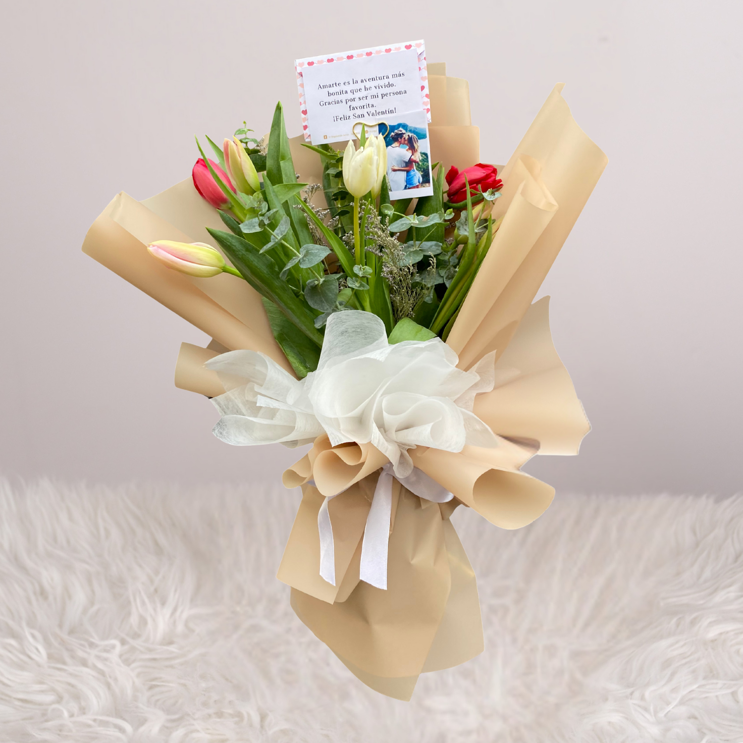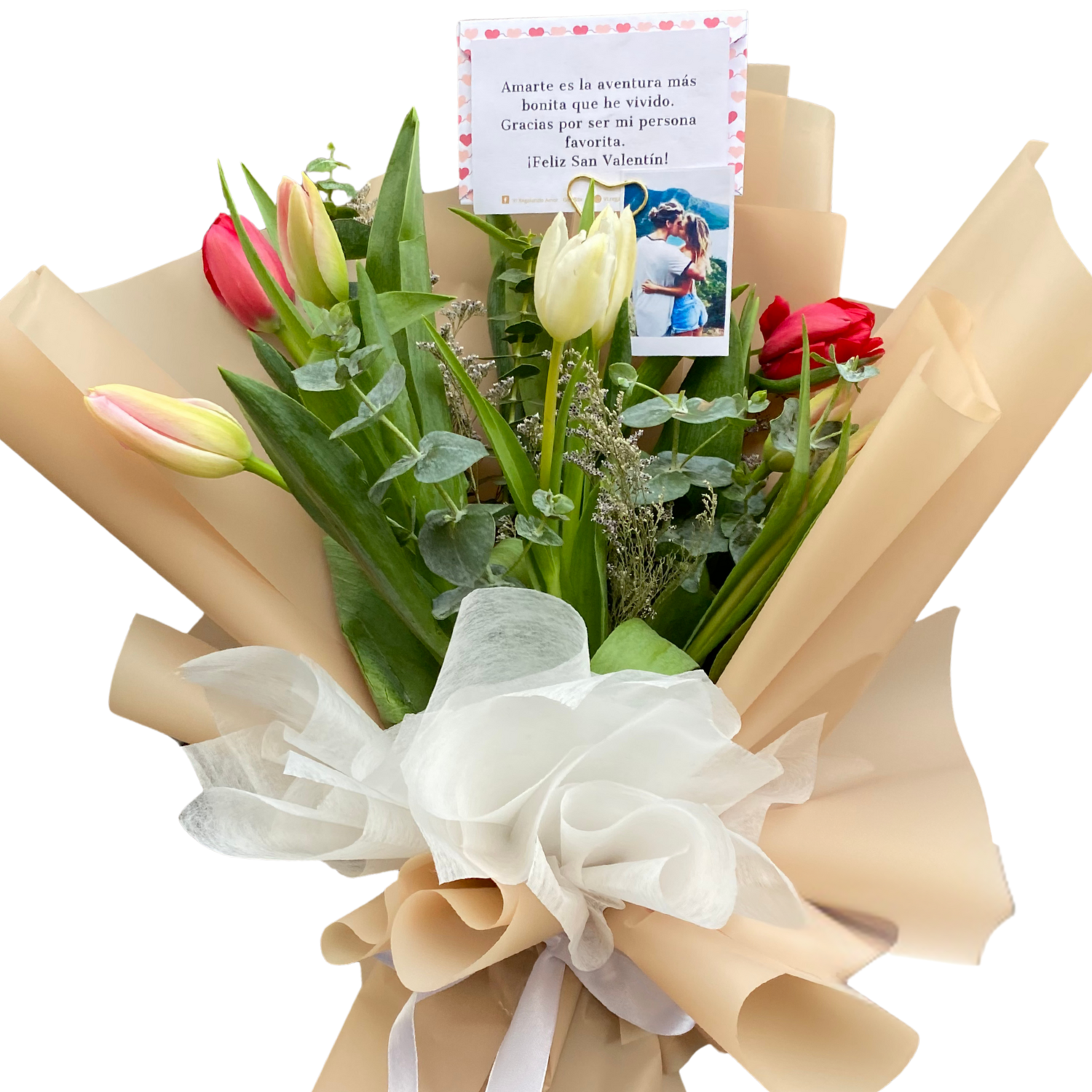 Un ramo elegante y lleno de frescura para este San Valentín. Con 10 tulipanes frescos y follaje aleatorio, creando una armoniosa combinación que transmite amor y sofisticación. Ideal para sorprender con un detalle único y natural. 💕