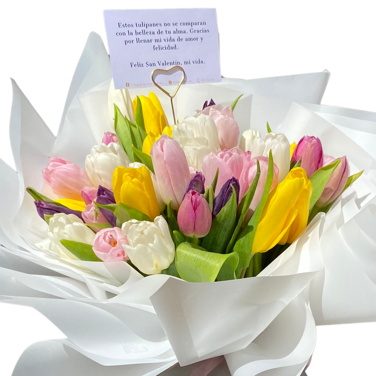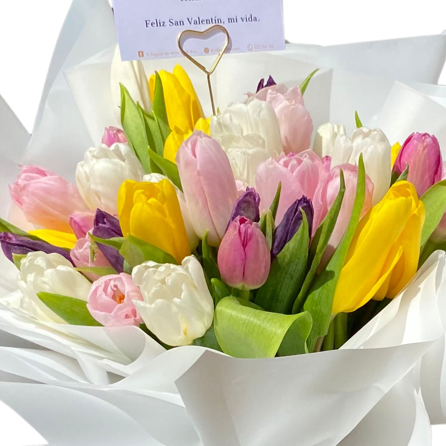 Un ramo vibrante y lleno de frescura para este San Valentín. Con 50 tulipanes de colores aleatorios, creando una explosión de colores y emociones. Perfecto para sorprender con un detalle único y lleno de vida. 💕