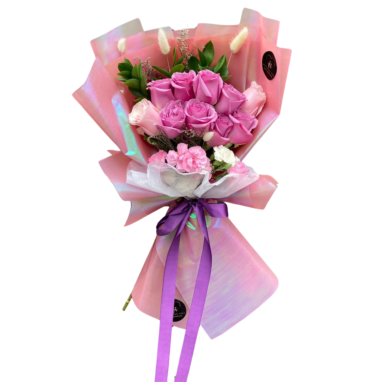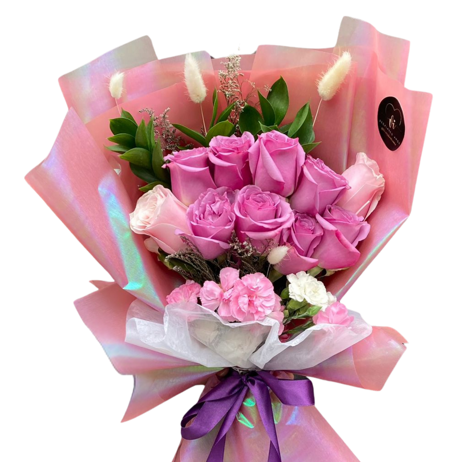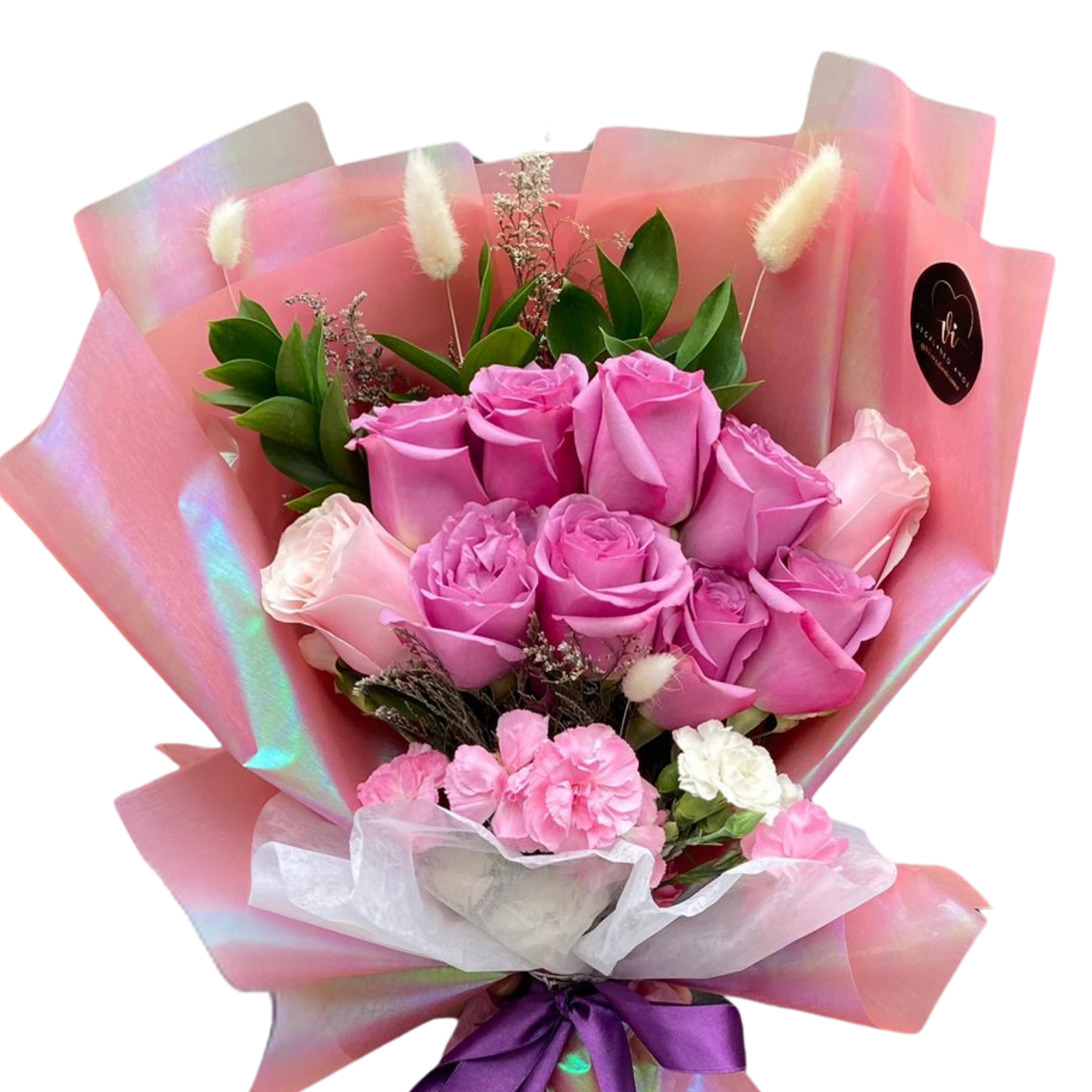 Un encantador arreglo de 8 elegantes rosas moradas y 2 delicadas rosas en tonos crema con un sutil matiz rosado, envueltas en papel tornasol que irradia un brillo especial y realza la belleza de cada flor.