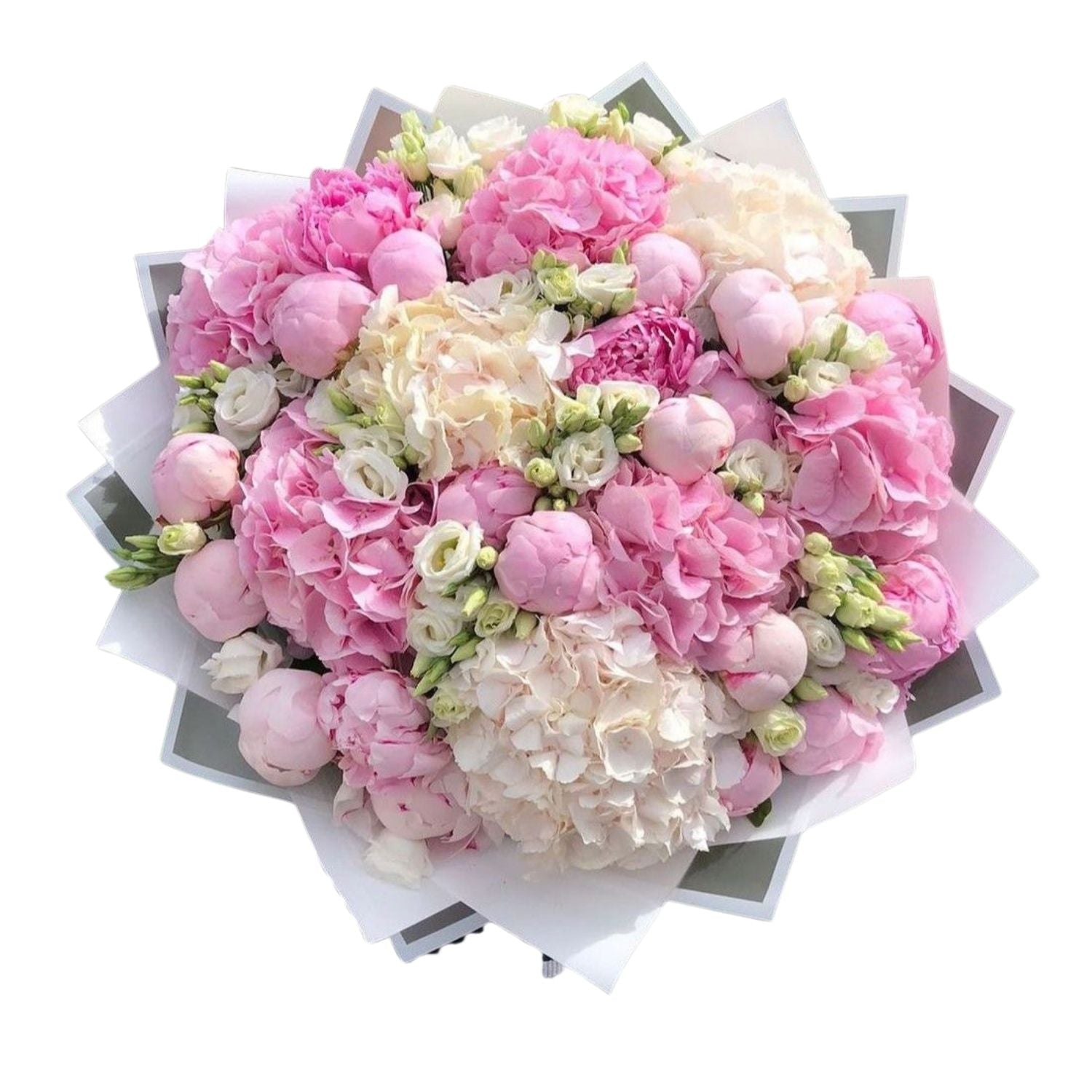 Un bouquet exuberante compuesto por 15 peonías, hortensias y lisianthus buchón, cuidadosamente combinados para crear una pieza floral sofisticada y de alto impacto visual. Ideal para quienes buscan un detalle elegante, romántico y exclusivo.