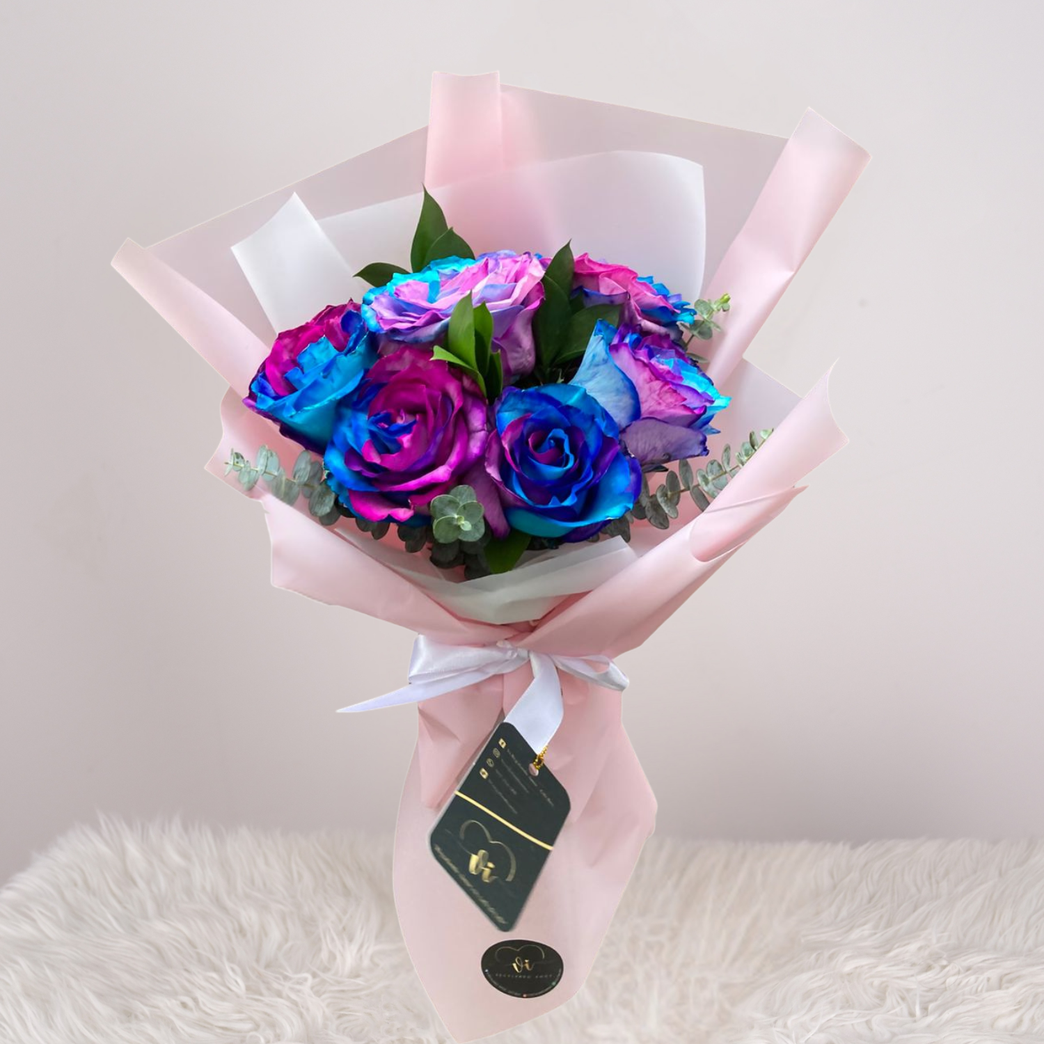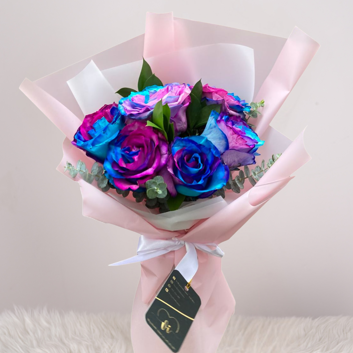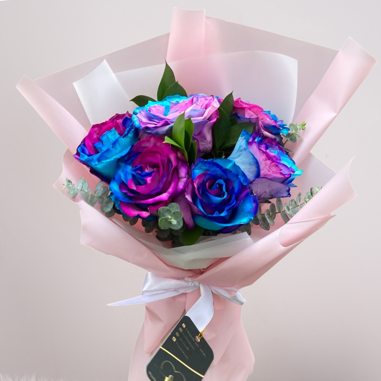 El Ramo Bibble combina encanto y fantasía con seis rosas cuidadosamente pigmentadas en tonos azul y rosado, creando un efecto visual lleno de dulzura y originalidad. Cada flor es única, ya que la pigmentación puede variar ligeramente en tonalidad, otorgando un acabado artesanal y especial a cada ramo. Ideal para regalar en momentos que merecen un toque mágico. Imagen referencial.