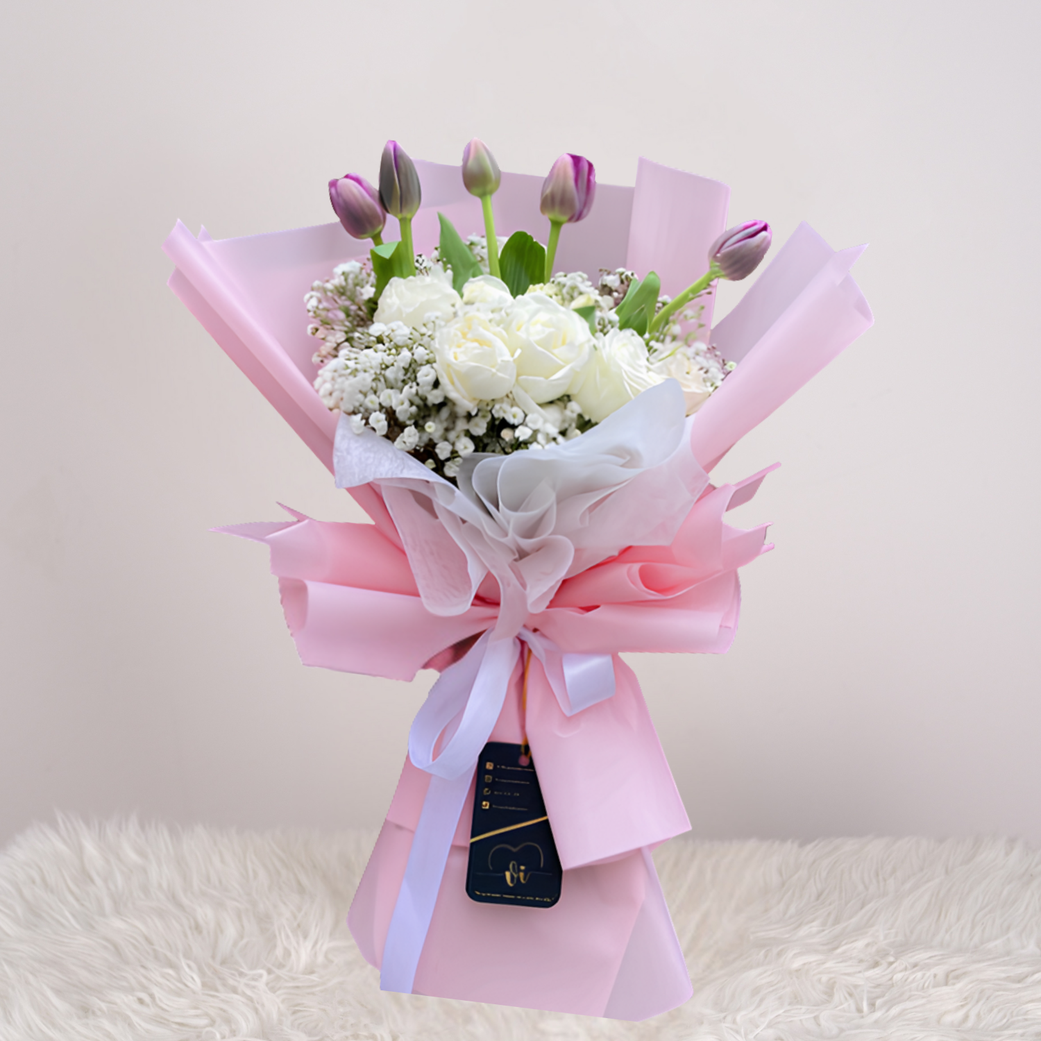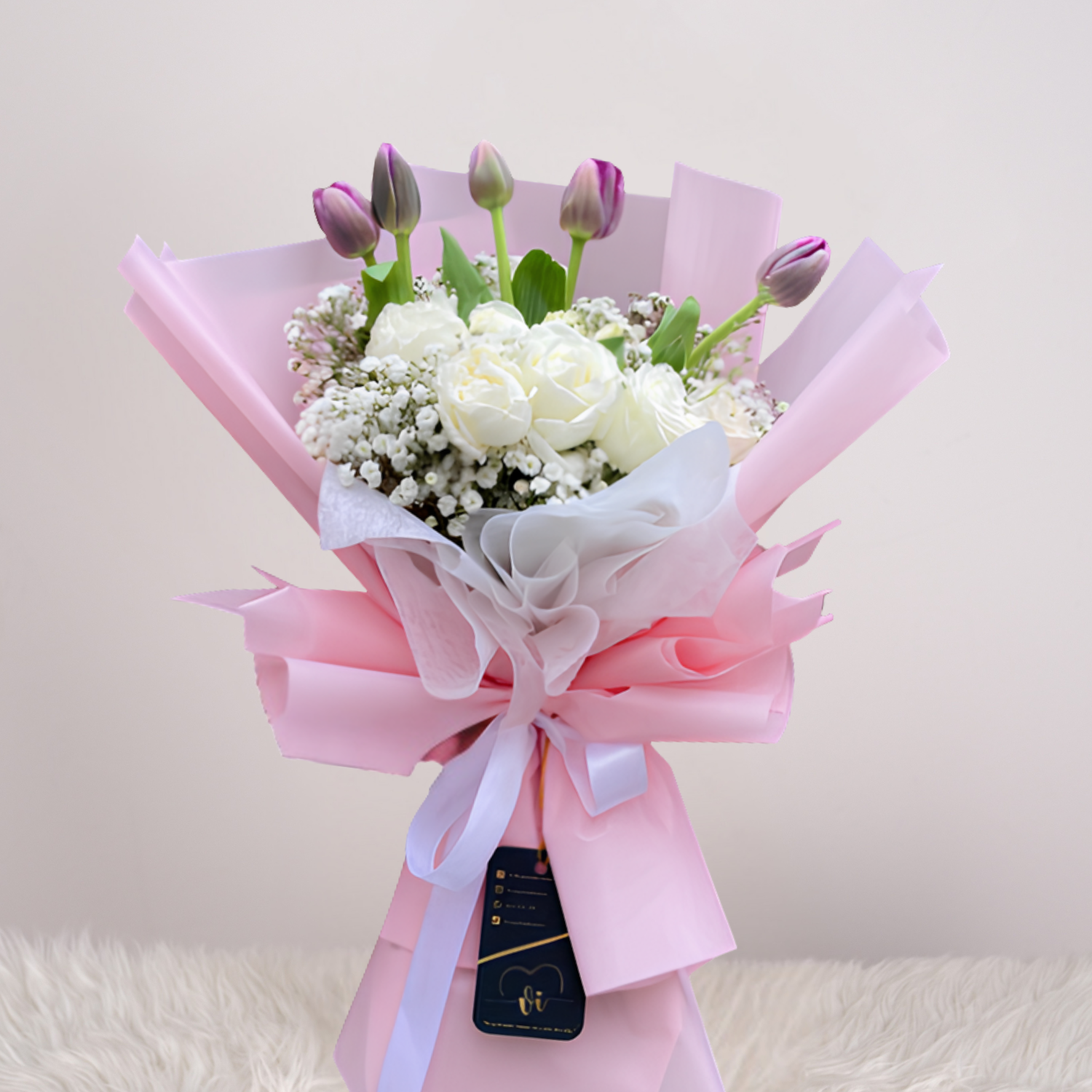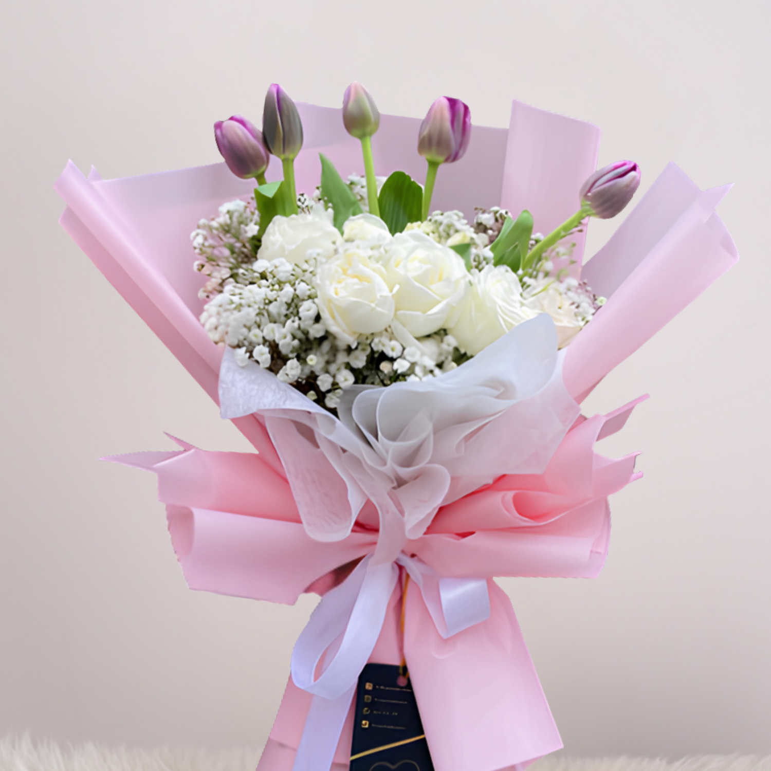Un diseño elegante y delicado que combina 5 tulipanes con 10 a 12 rosas inglesas blancas, complementadas con variedad floral y follaje fresco. Las rosas inglesas, aunque parecidas a las peonias, son más pequeñas y destacan por su forma romántica y textura aterciopelada.