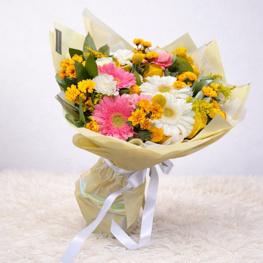 Un ramo luminoso y elegante que combina 20 rosas en tonos amarillos y blancos, acompañadas de gerberas y variedad floral amarilla. Su diseño transmite frescura, vitalidad y alegría, convirtiéndolo en el detalle perfecto para dar la bienvenida, celebrar ocasiones especiales o sorprender con un gesto primaveral.