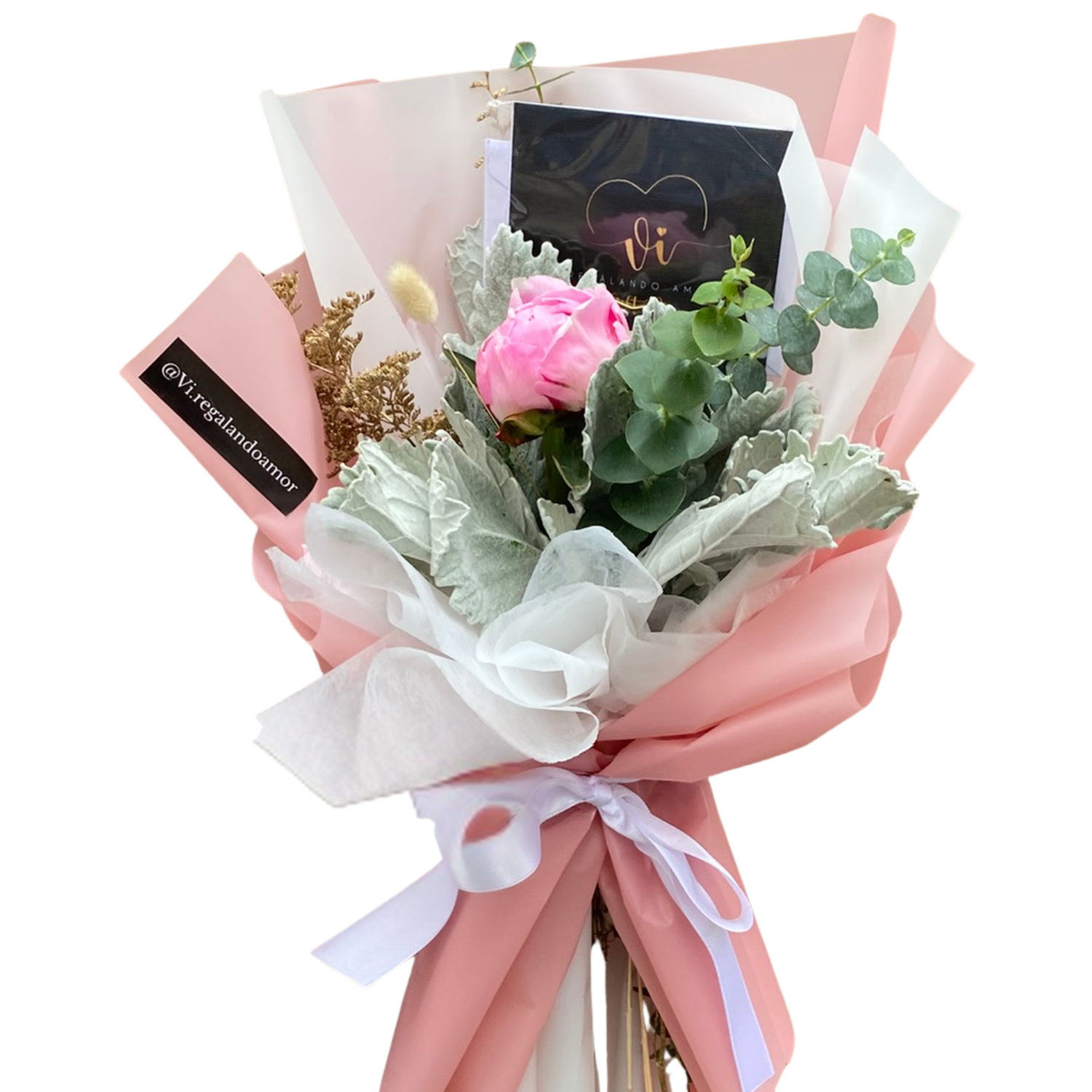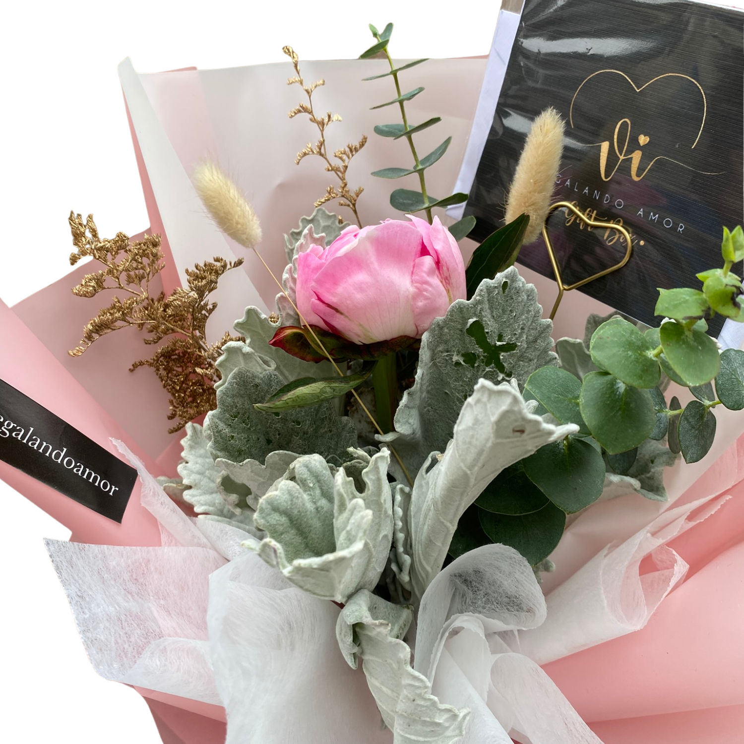 Ramo de 1 peonía en color aleatorio (rojo, rosado o blanco), acompañada de variedad floral que realza su elegancia y delicadeza. Ideal para sorprender con un detalle único y sofisticado.