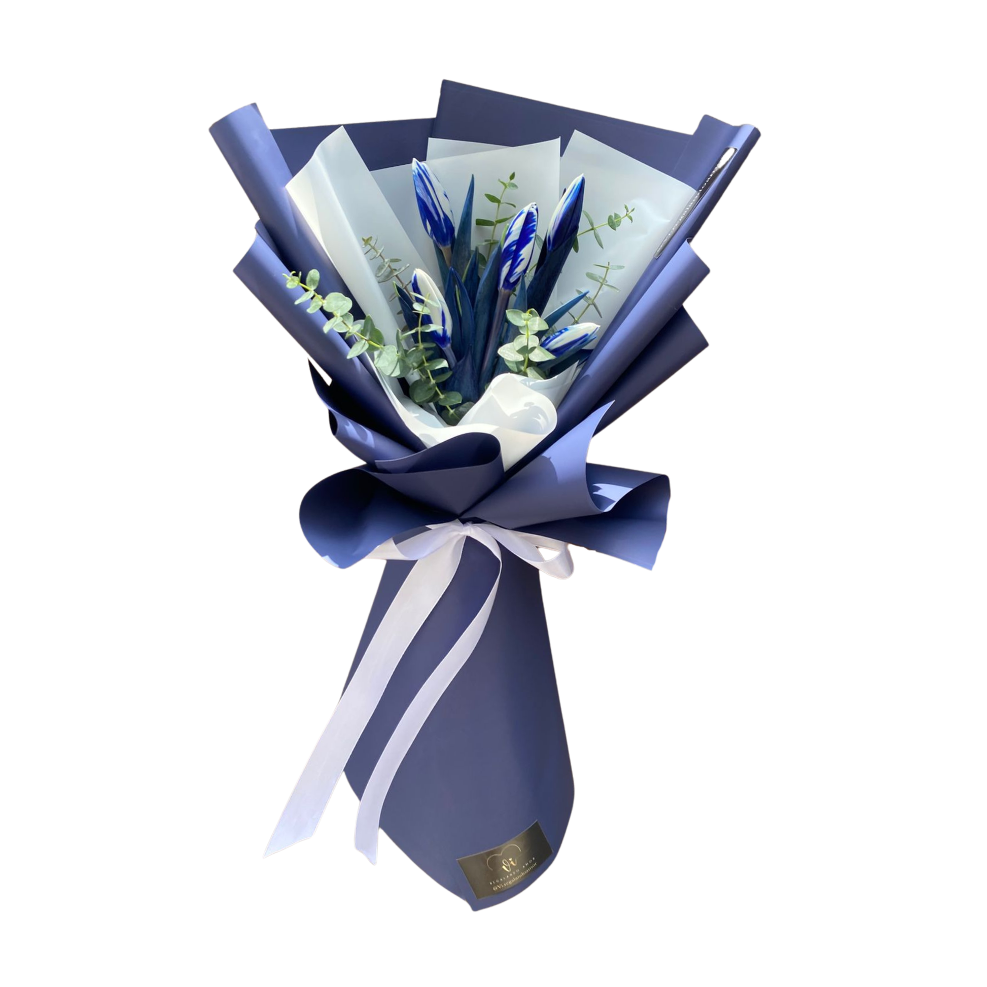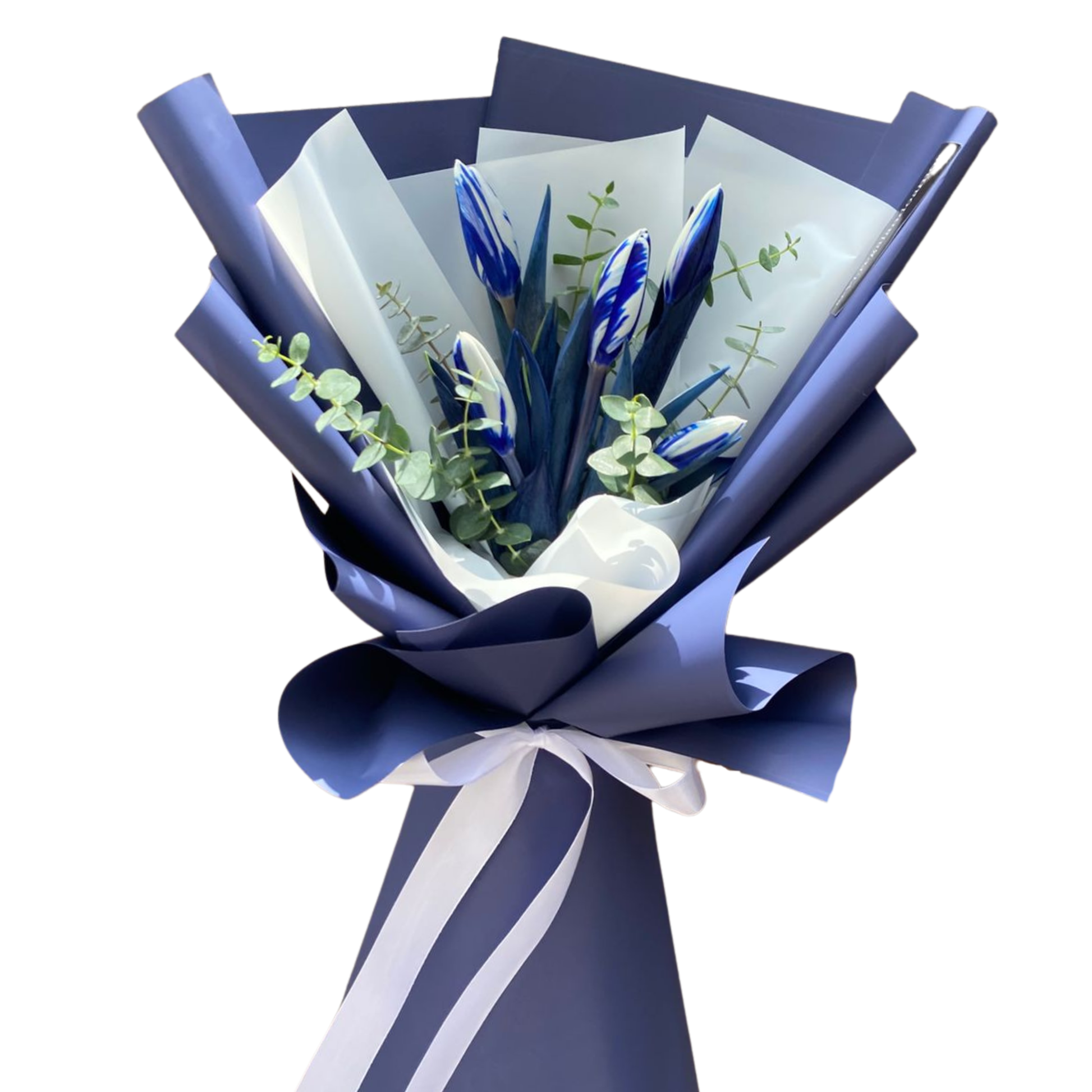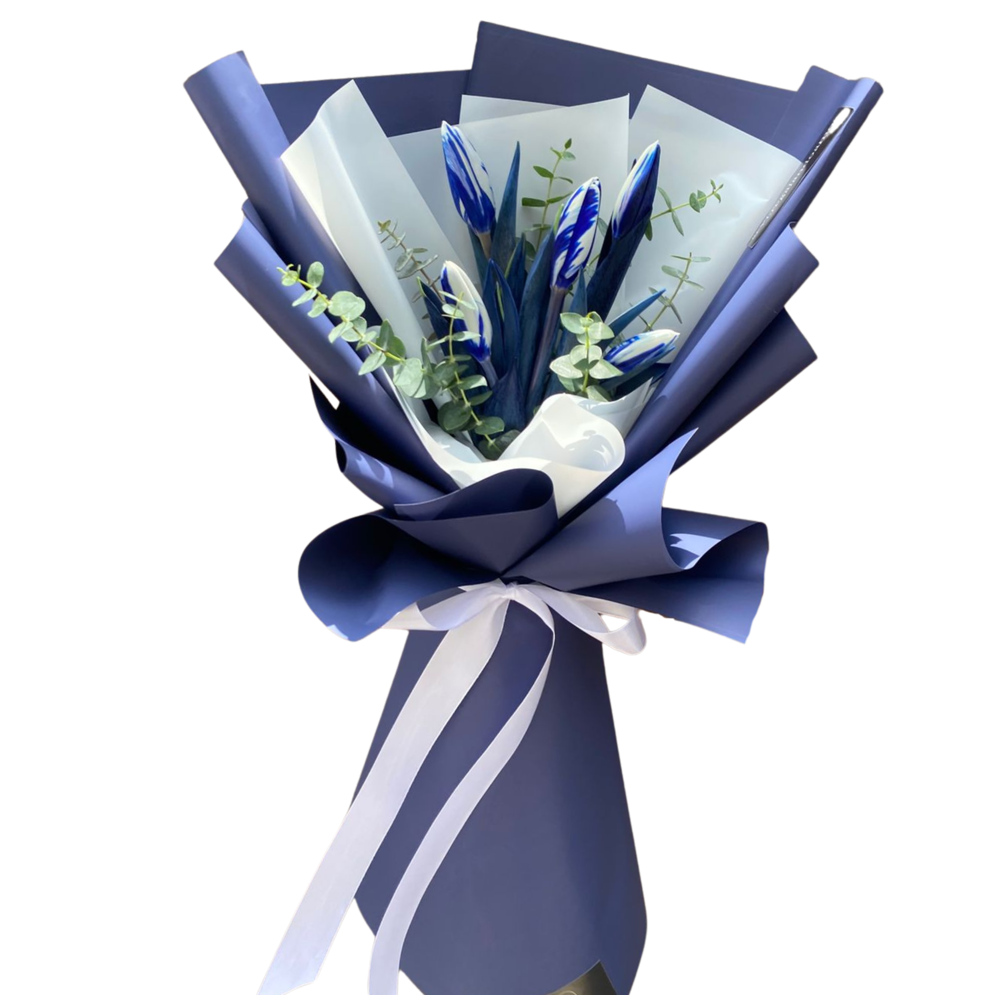 Un diseño elegante y moderno compuesto por cinco tulipanes naturales pigmentados artesanalmente en tonos azul y blanco, con un efecto marmoleado que recuerda delicadas manchas o pinceladas únicas en cada pétalo.