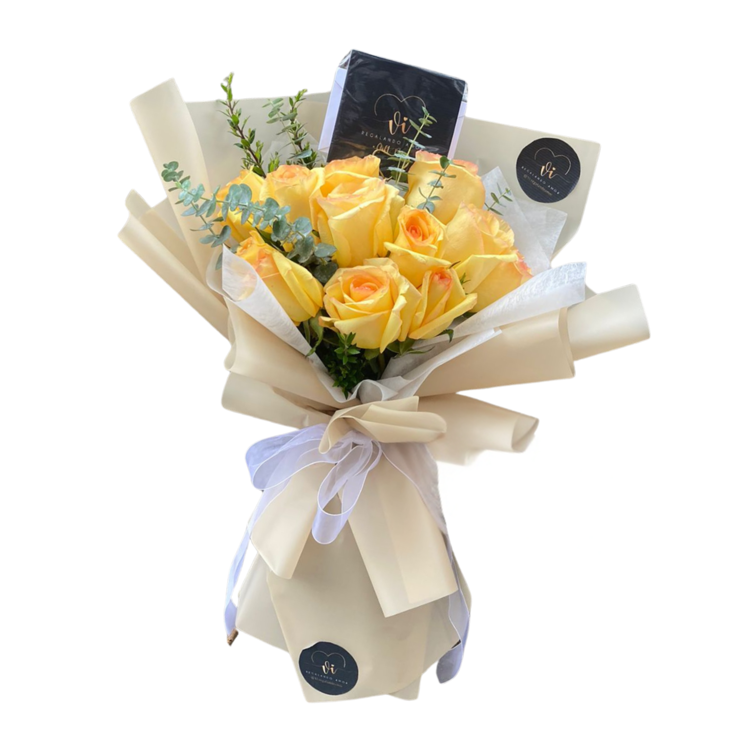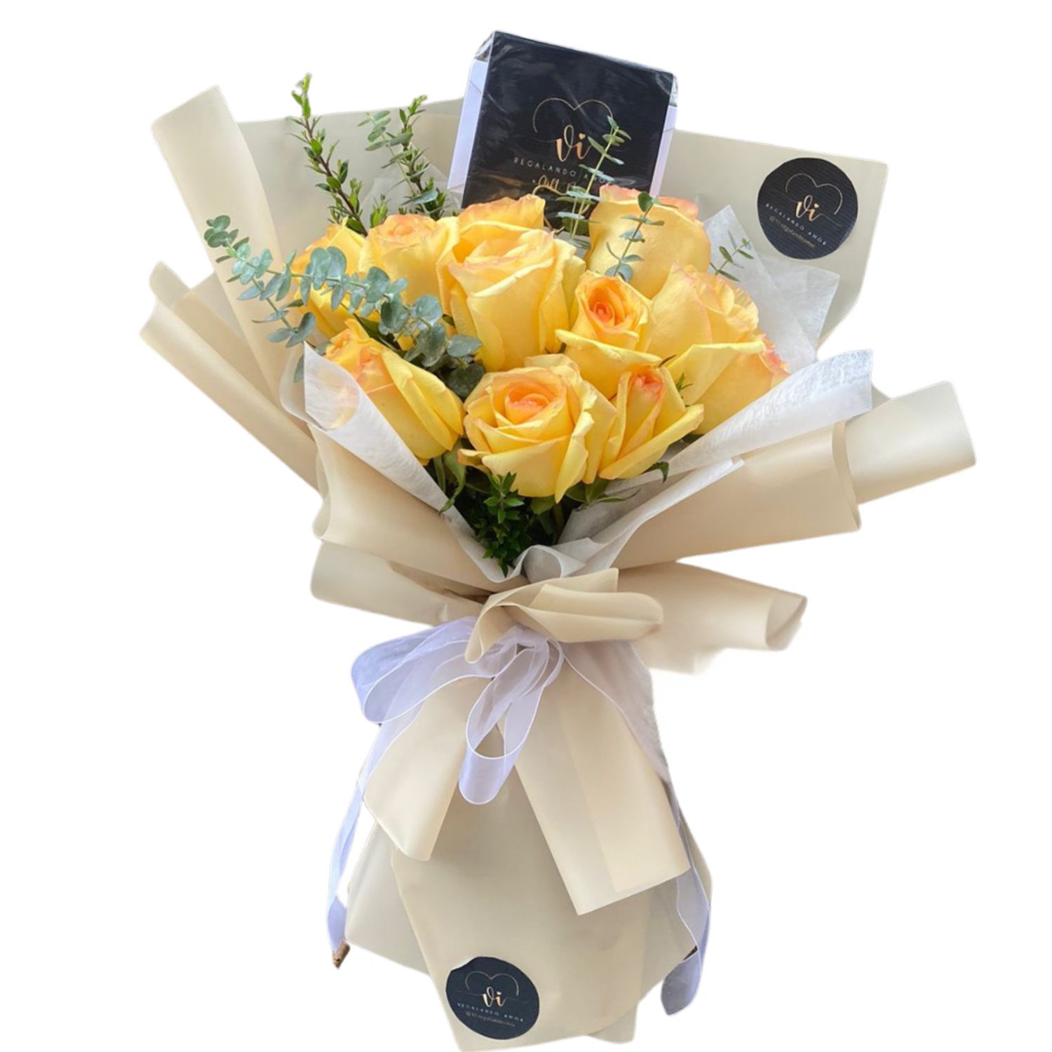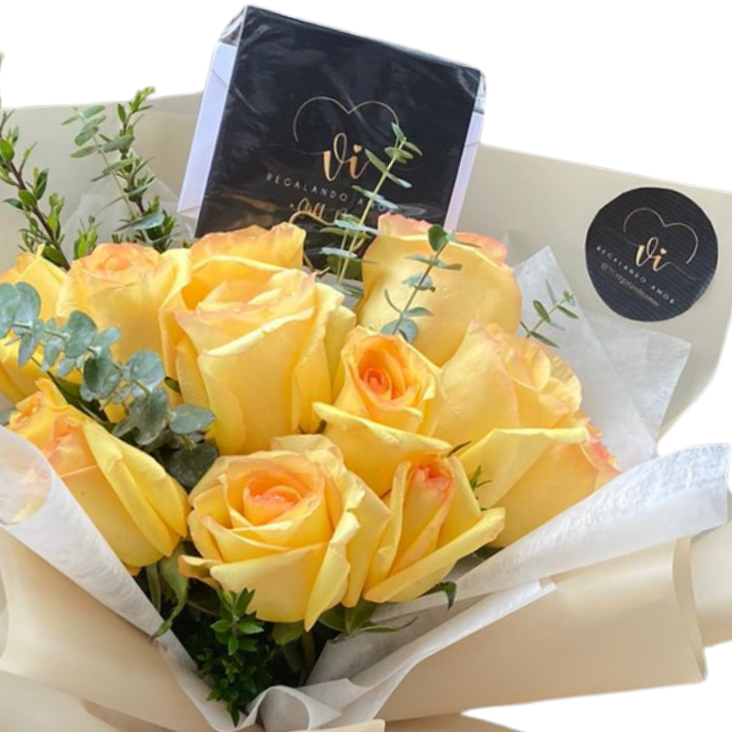 El Ramo Diana es una obra de elegancia y estilo, compuesto por 12 hermosas rosas amarillas que simbolizan alegría y nuevos comienzos. Las rosas están envueltas en un fino papel beige que resalta su belleza natural, complementadas con un follaje verde fresco que añade un toque de frescura y equilibrio.