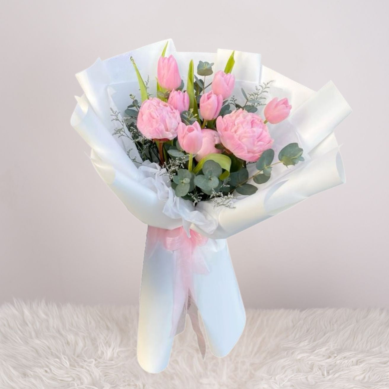 Un arreglo elegante compuesto por 3 peonías y 6 tulipanes con follaje natural, diseñado para transmitir sofisticación y dulzura en cada detalle. Las peonías están disponibles en colores aleatorios entre rosado, rojo o blanco, según la temporada. Este producto es exclusivo y de disponibilidad limitada, ya que las peonías solo llegan por tiempo determinado.
