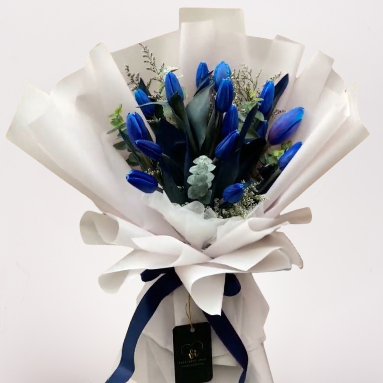 Un ramo elegante y moderno compuesto por 15 tulipanes azules, símbolo de confianza y serenidad. Perfecto para expresar sentimientos únicos y diferentes.
