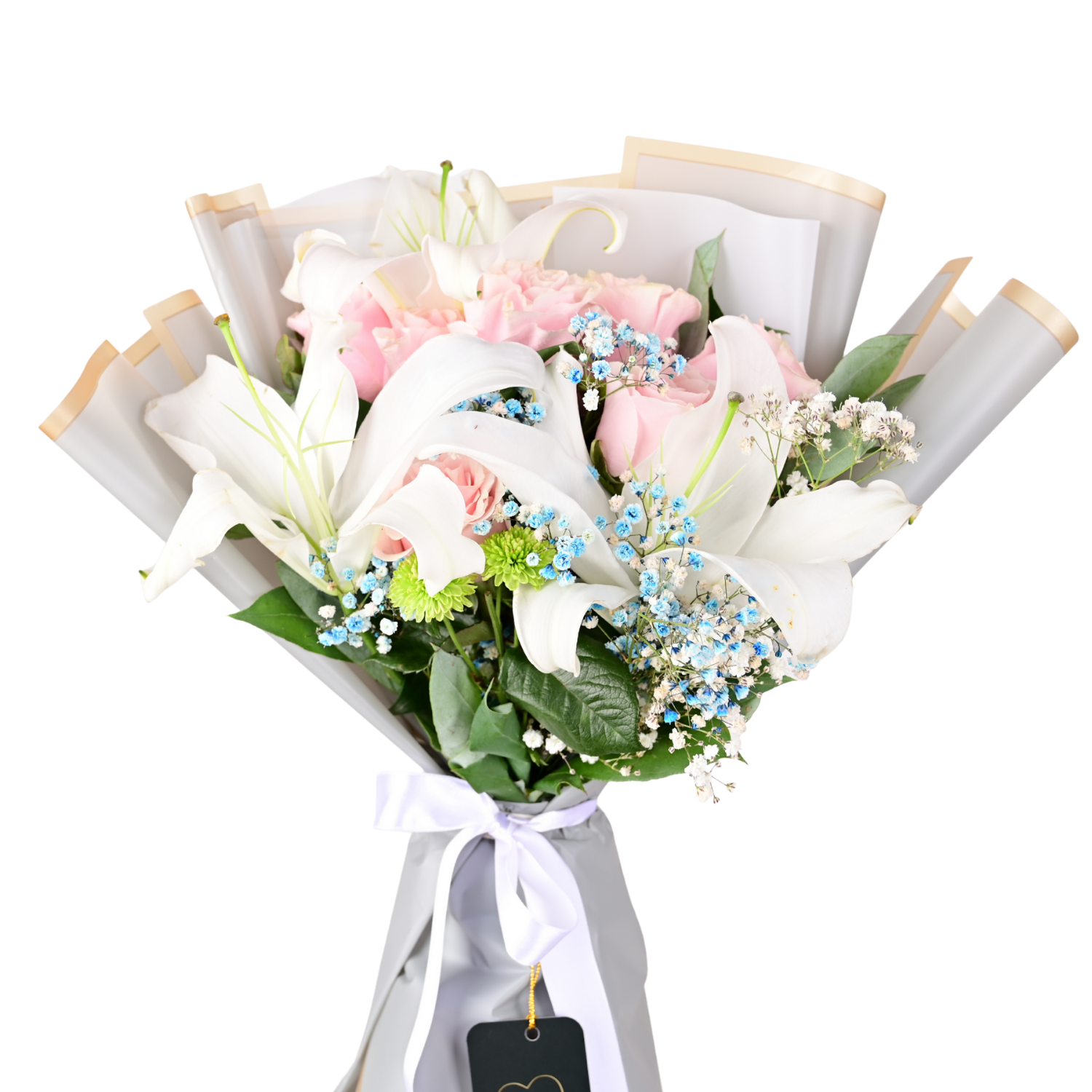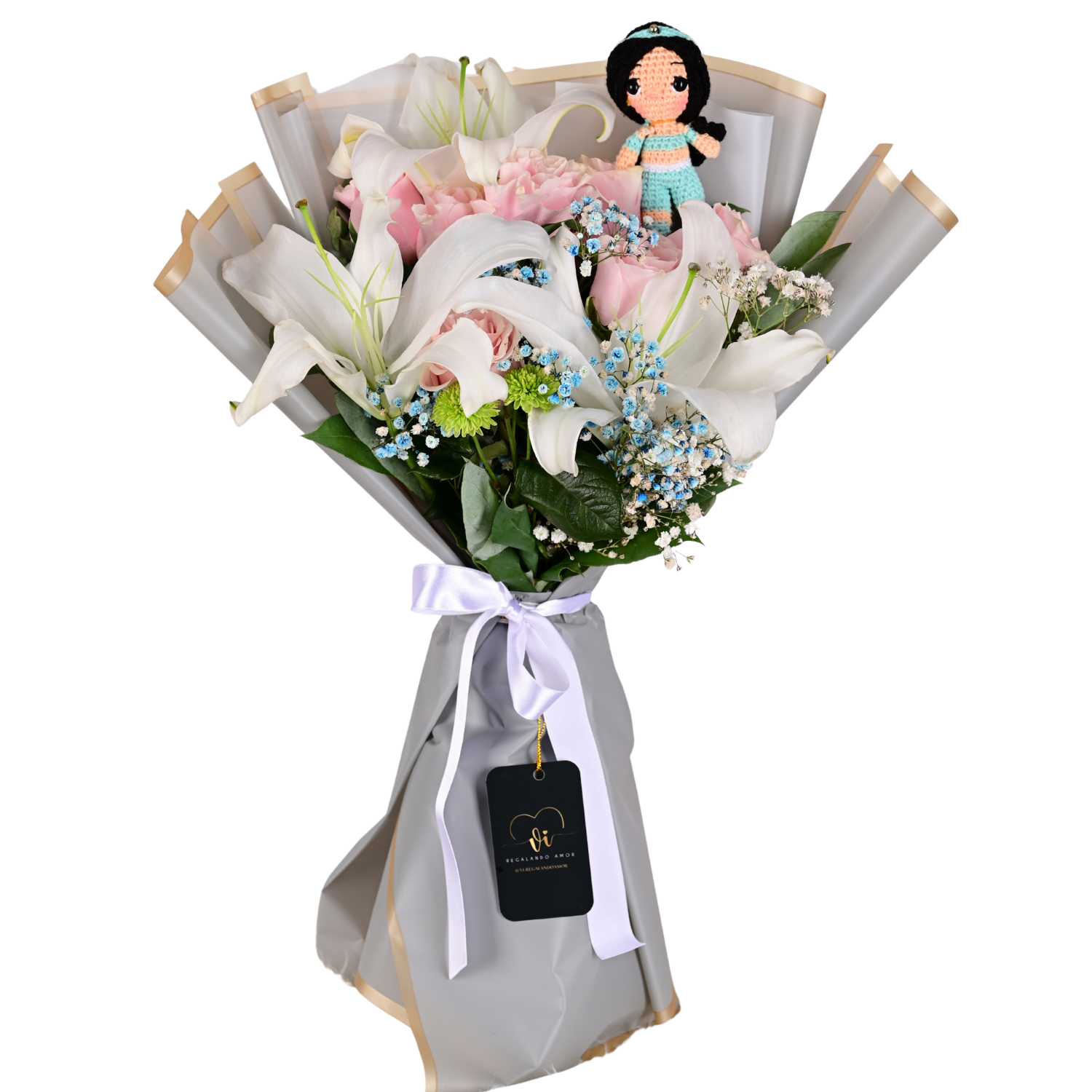 Rosas rosadas, lirios y flores de temporada cuidadosamente seleccionadas, acompañadas por el amigurumi de Jasmín. Este diseño floral evoca la libertad, la elegancia y la belleza clásica inspirada en Agrabah. Ideal para sorprender con un regalo único y lleno de significado.