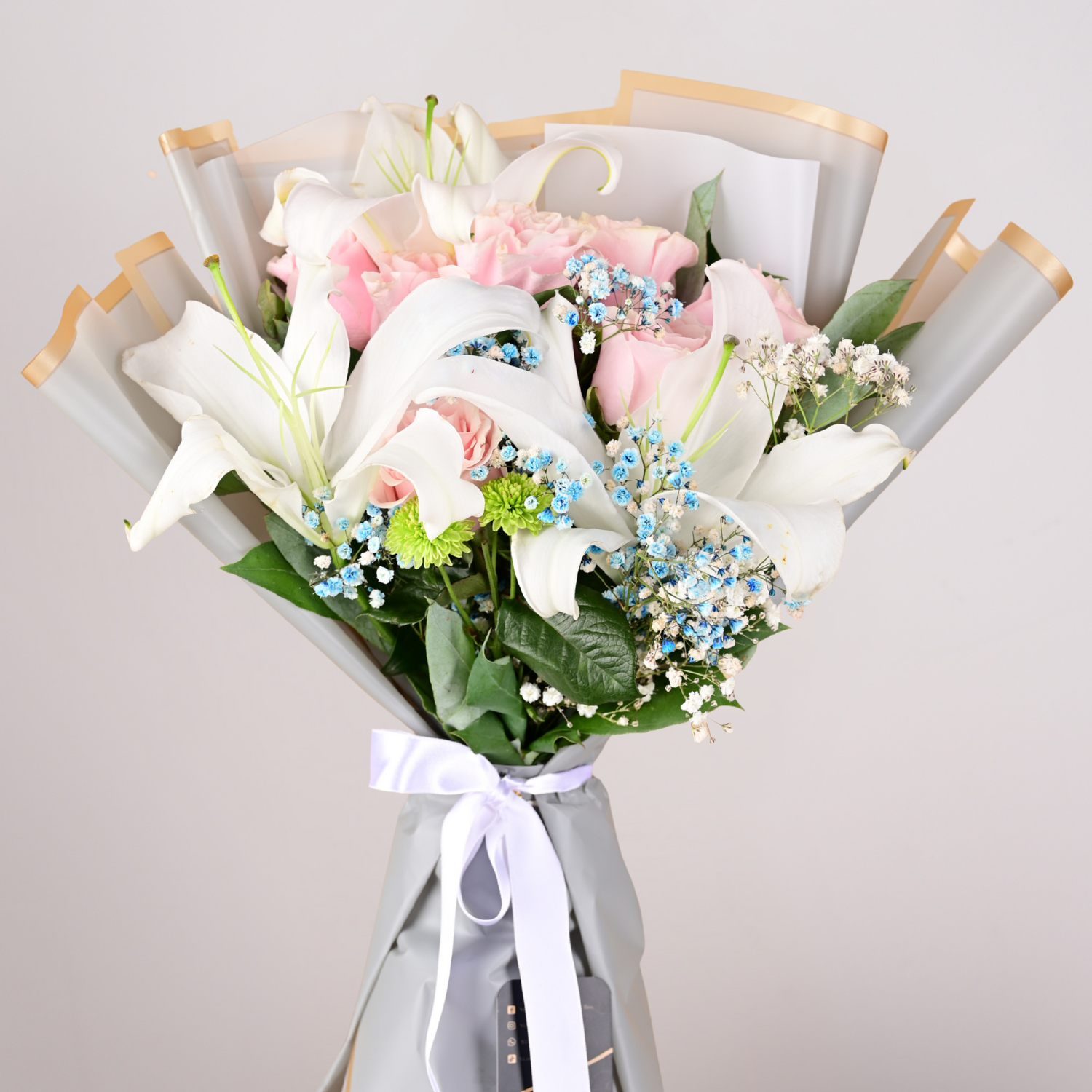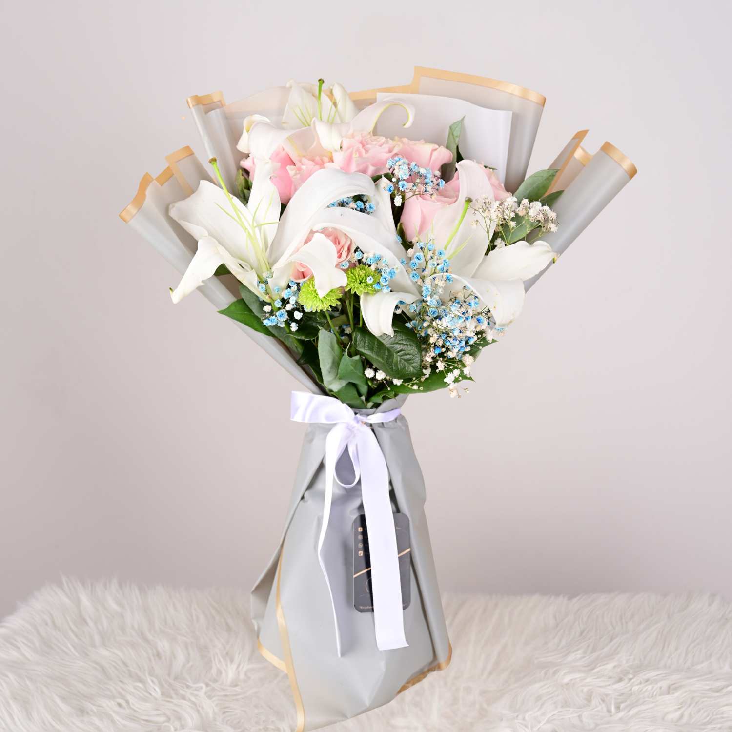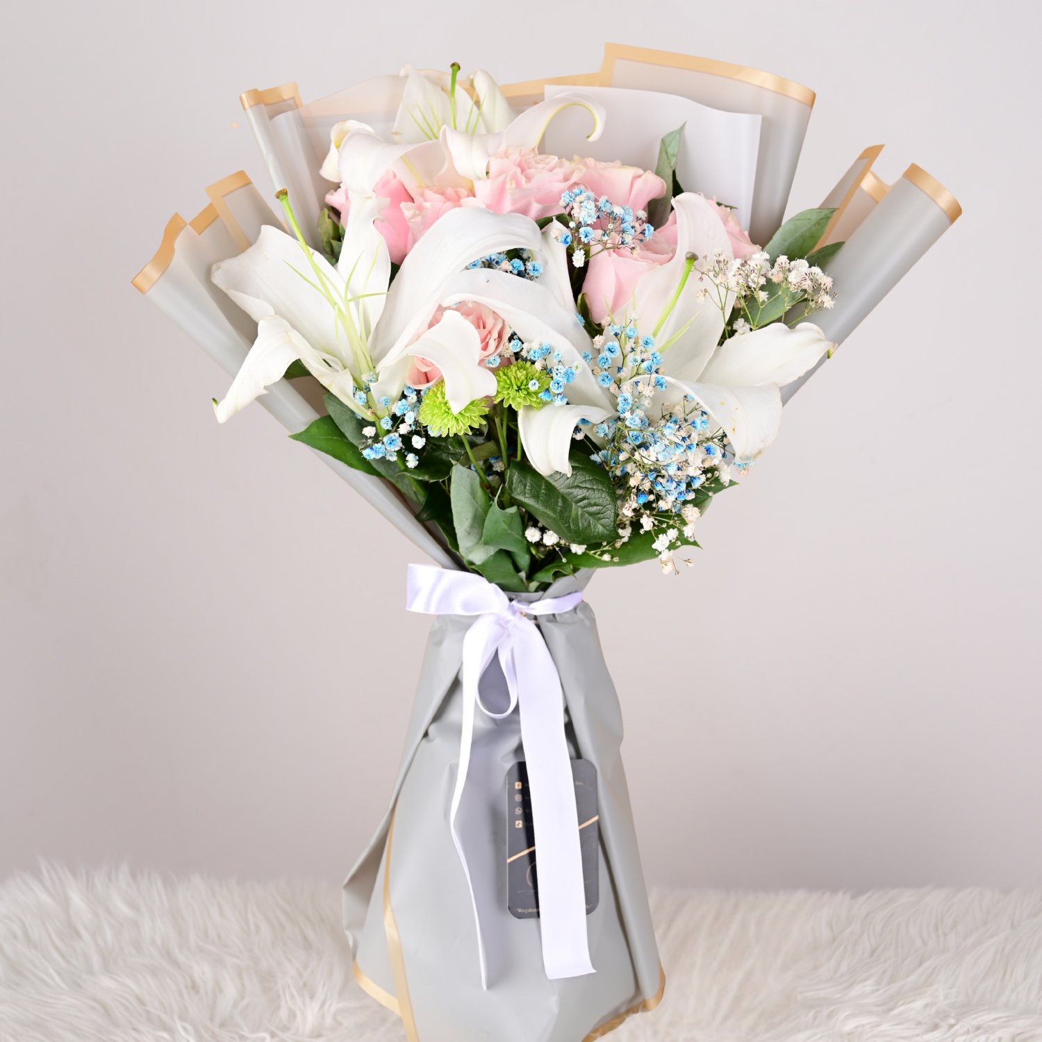 Un ramo elegante con flores en tonos Blanco y Rosado, inspirado en la princesa de Agrabah. Su mezcla de frescura y distinción evoca libertad y sueños cumplidos. Ideal para quienes buscan belleza y autenticidad.