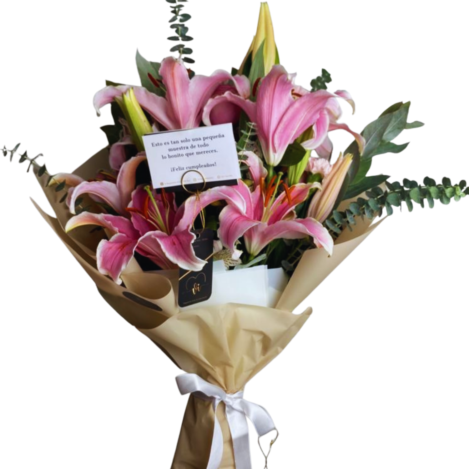 Sorprende con la delicadeza y elegancia del Ramo Lira, compuesto por hermosos lirios rosados.