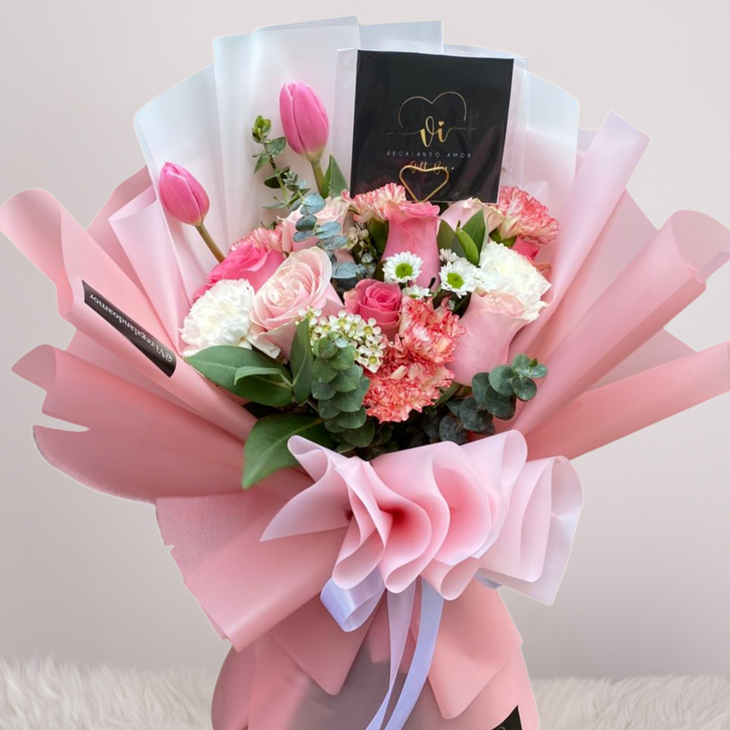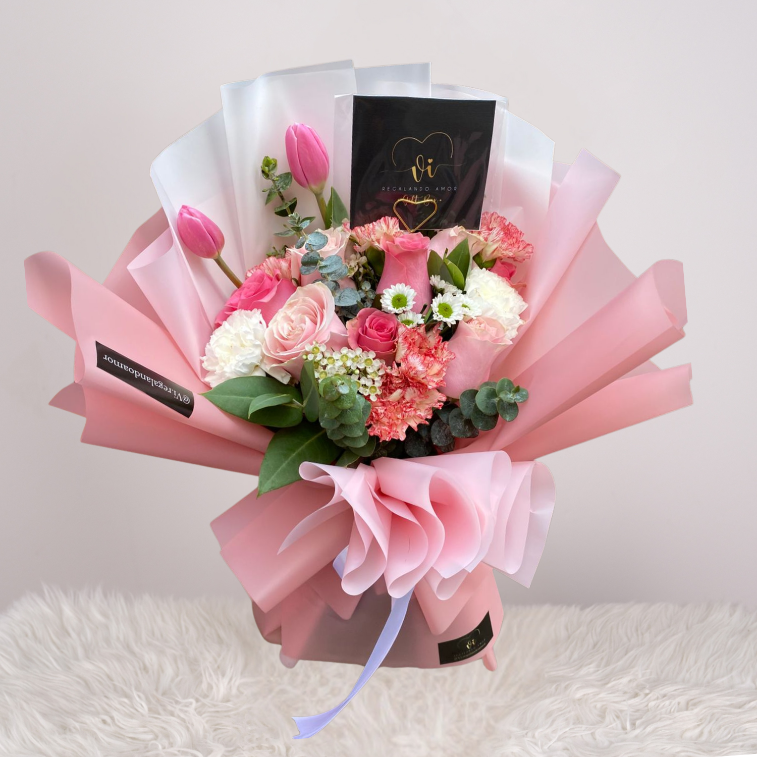 El Ramo Martina es una propuesta delicada y romántica que combina 3 tulipanes, 8 rosas en tonos rosados, claveles, wats y follaje natural. Su armonía de colores suaves transmite ternura y elegancia, convirtiéndolo en el detalle perfecto para expresar cariño, gratitud o amor en cualquier ocasión especial.