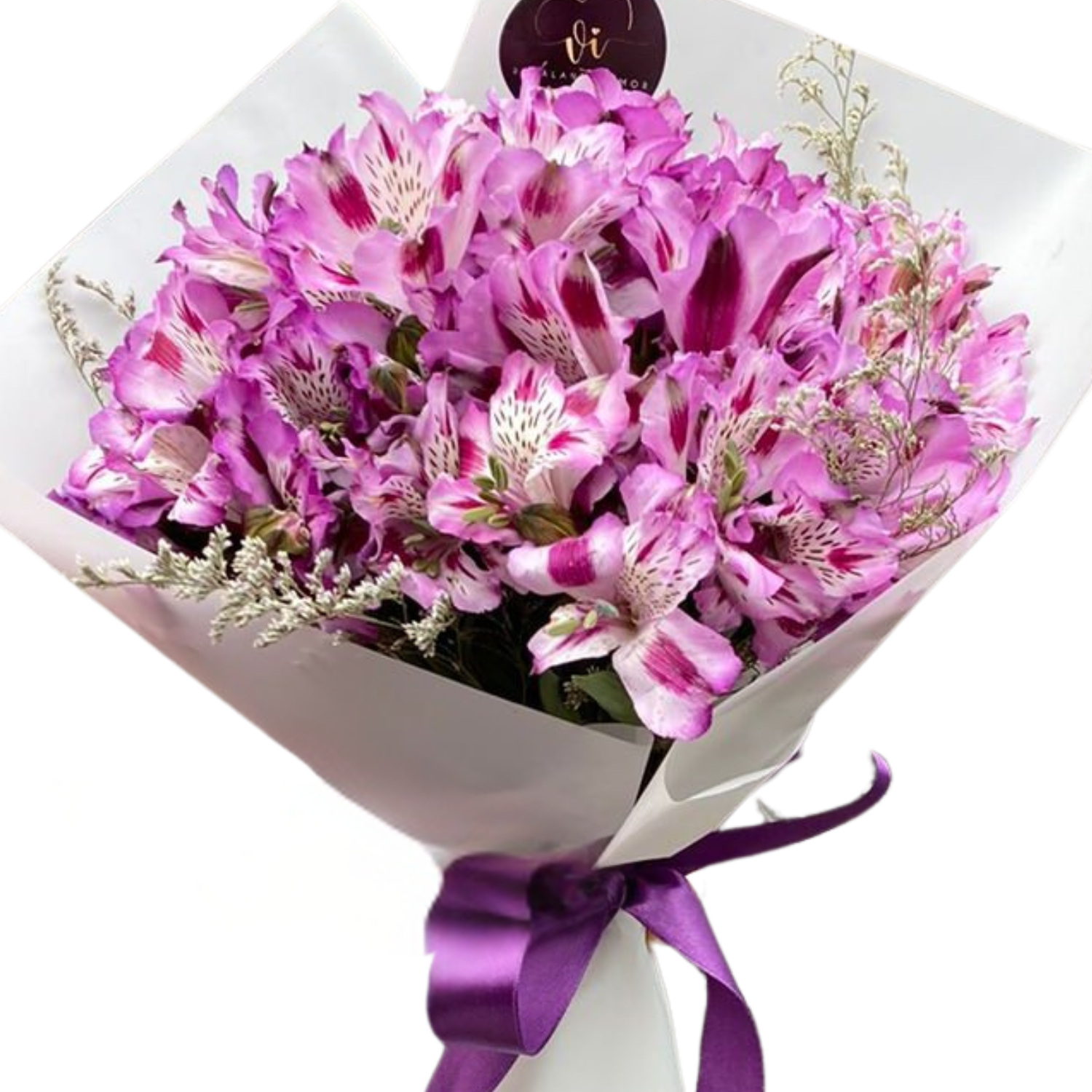 Cada astromelia, con sus pétalos exquisitos, crea un ramo que es a la vez majestuoso y delicado. Perfecto para expresar admiración o enviar un mensaje de misterio, este ramo de astromelias moradas es una elección distintiva que destaca en cualquier ocasión.