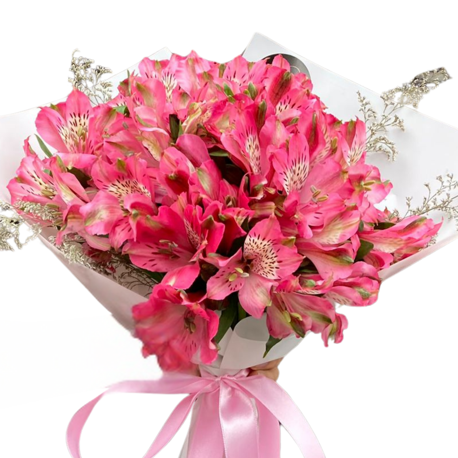La suavidad de estas hermosas flores en tonos rosados es un tributo a la ternura y la elegancia. Cada astromelias, con sus pétalos delicadamente arreglados, contribuye a un ramo que irradia feminidad y encanto. Ideal para expresar cariño o celebrar momentos especiales, este ramo de astromelias rosadas es una elección encantadora que ilumina cualquier día.