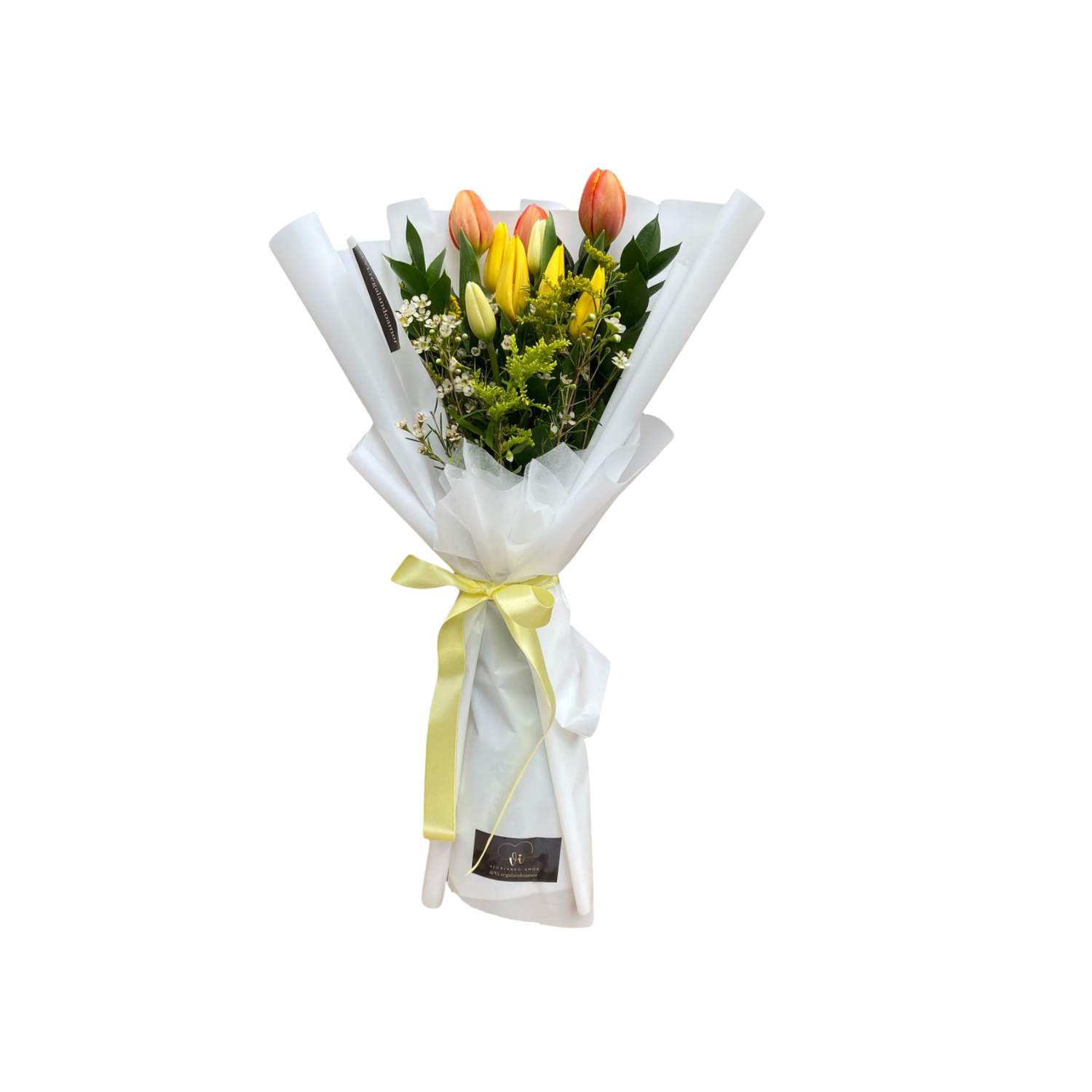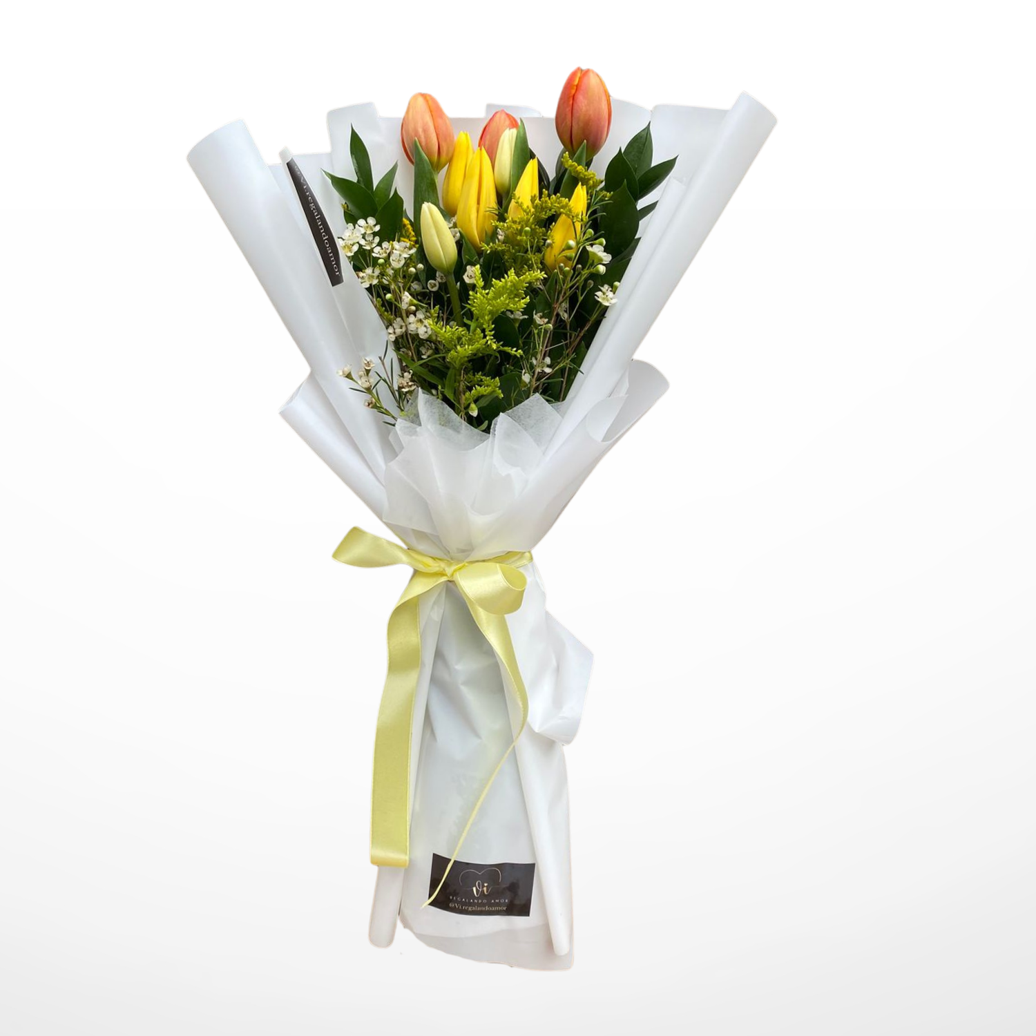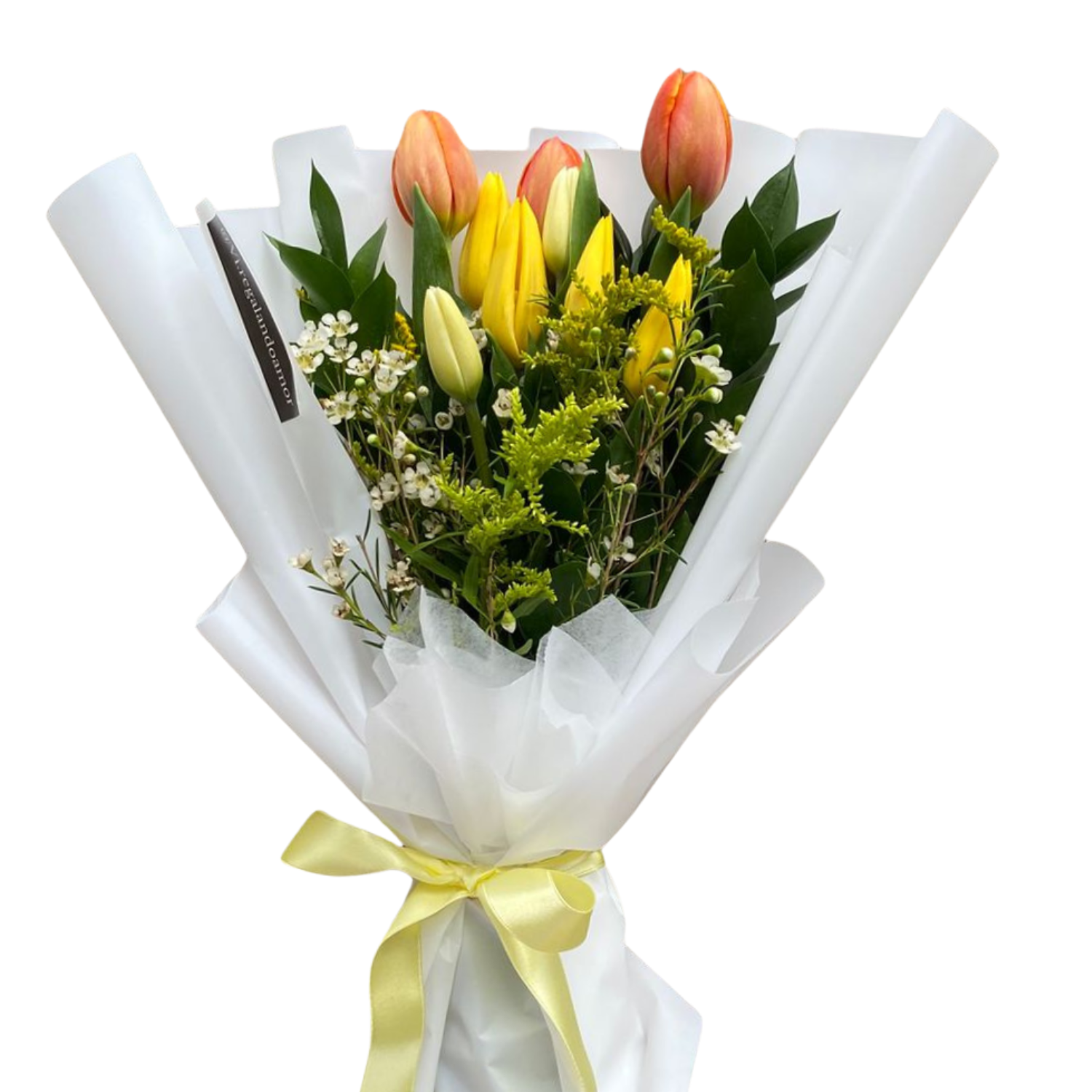 Un ramo vibrante y lleno de energía que combina 10 tulipanes frescos en tonos rojos, amarillos o naranjas, acompañados de variedad floral. Su diseño colorido y elegante lo convierte en la elección ideal para celebrar momentos especiales, dar la bienvenida o transmitir alegría con un gesto primaveral.