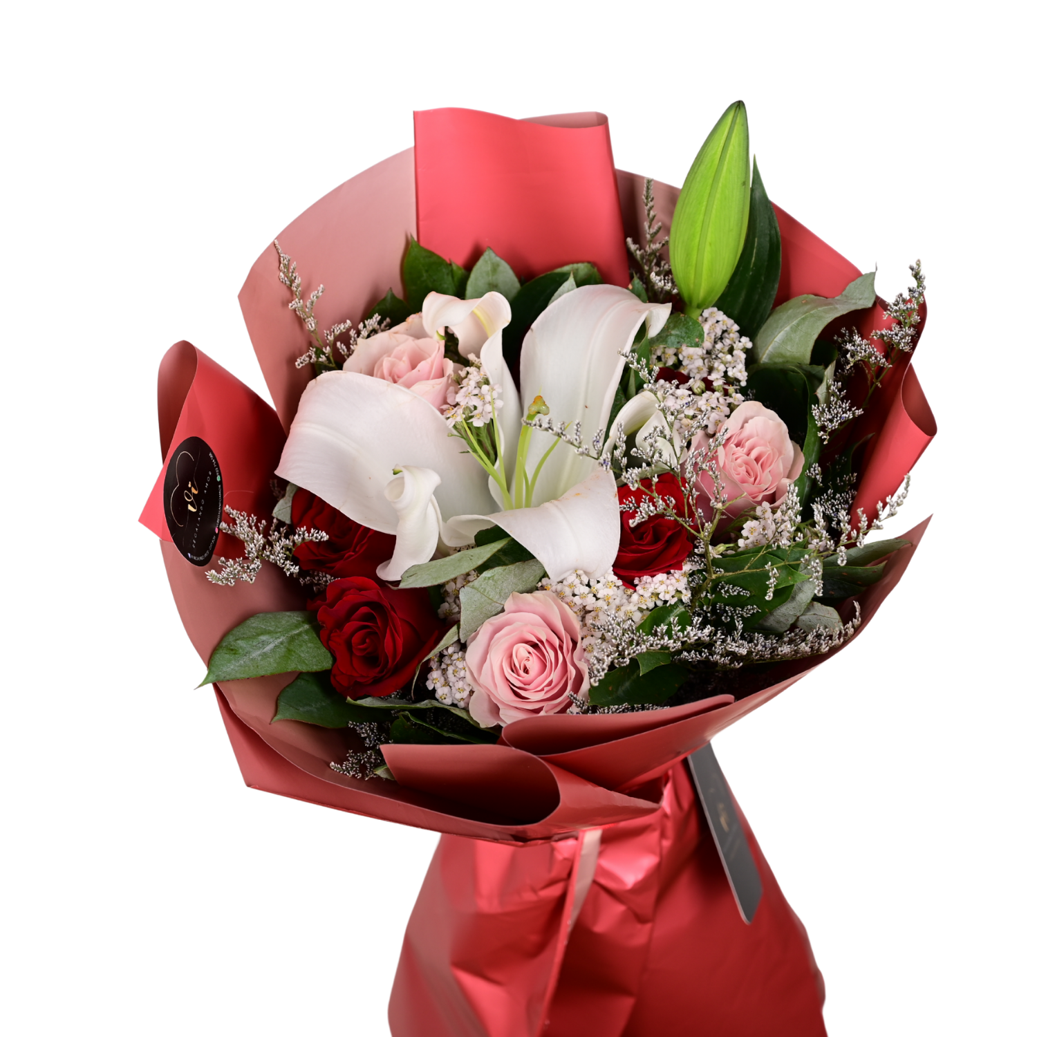 Un arreglo que simboliza valentía y determinación. Este diseño combina rosas rojas y rosadas con lirios blancos y eucalipto, creando una armonía perfecta entre fuerza y delicadeza. Acompañado de un adorable amigurumi de Mulán, es el regalo ideal para inspirar coraje y resiliencia.