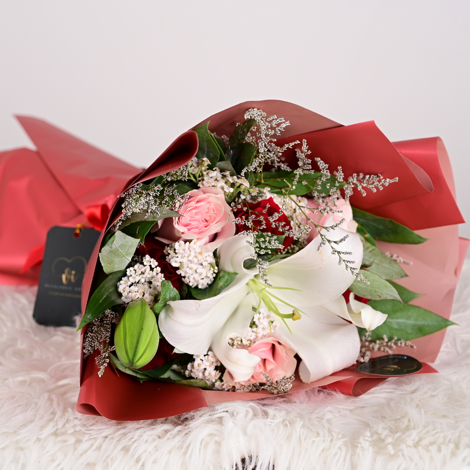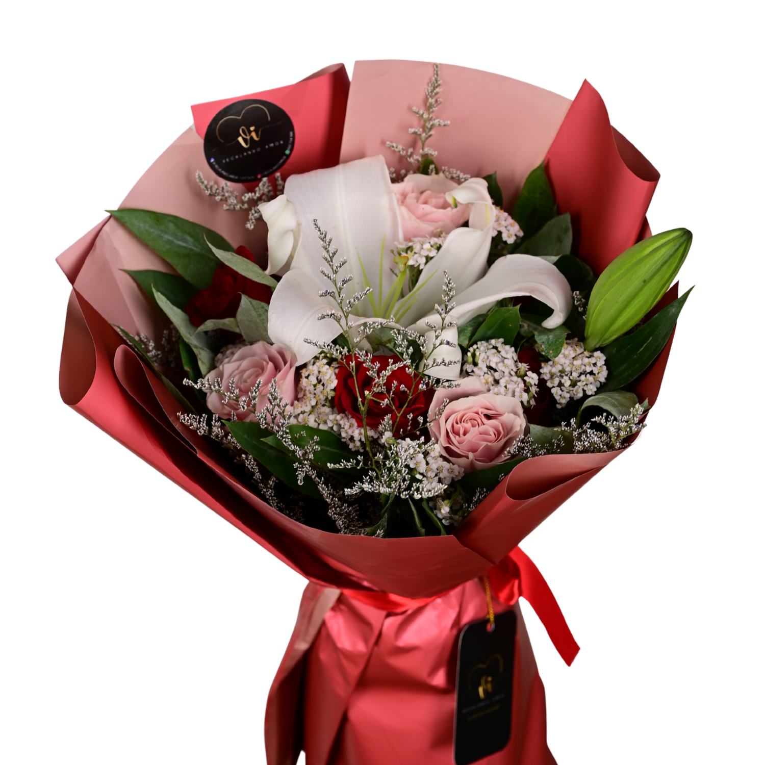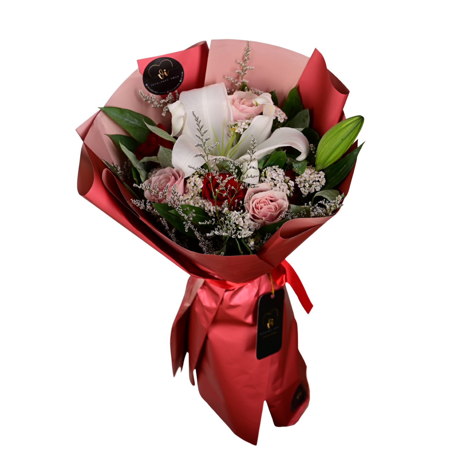 El Ramo Mulán está inspirado en la valentía y elegancia de la princesa de oriente. Combina lirios blancos con rosas en delicados tonos, envueltos en una presentación roja que simboliza fuerza, pasión y honor.
