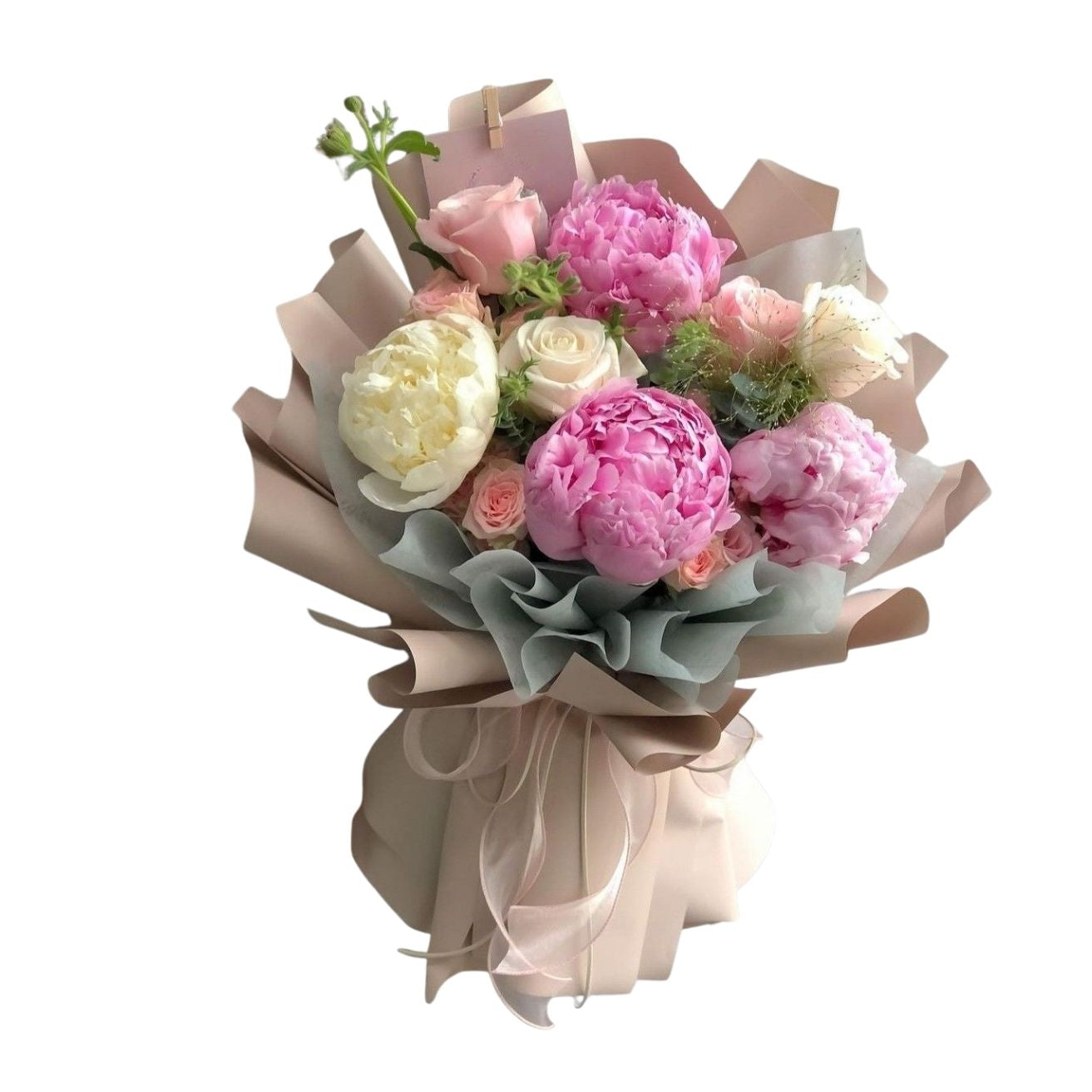 Un diseño romántico y sofisticado que combina 4 peonías con rosas clásicas y mini rosas, creando una composición armoniosa ideal para expresar cariño y elegancia. La envoltura puede variar según el stock disponible, manteniendo siempre la calidad y el estilo característico de nuestra marca.