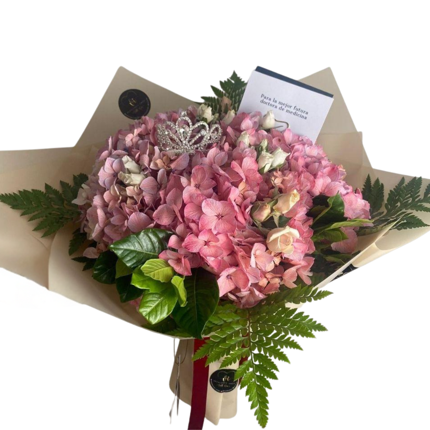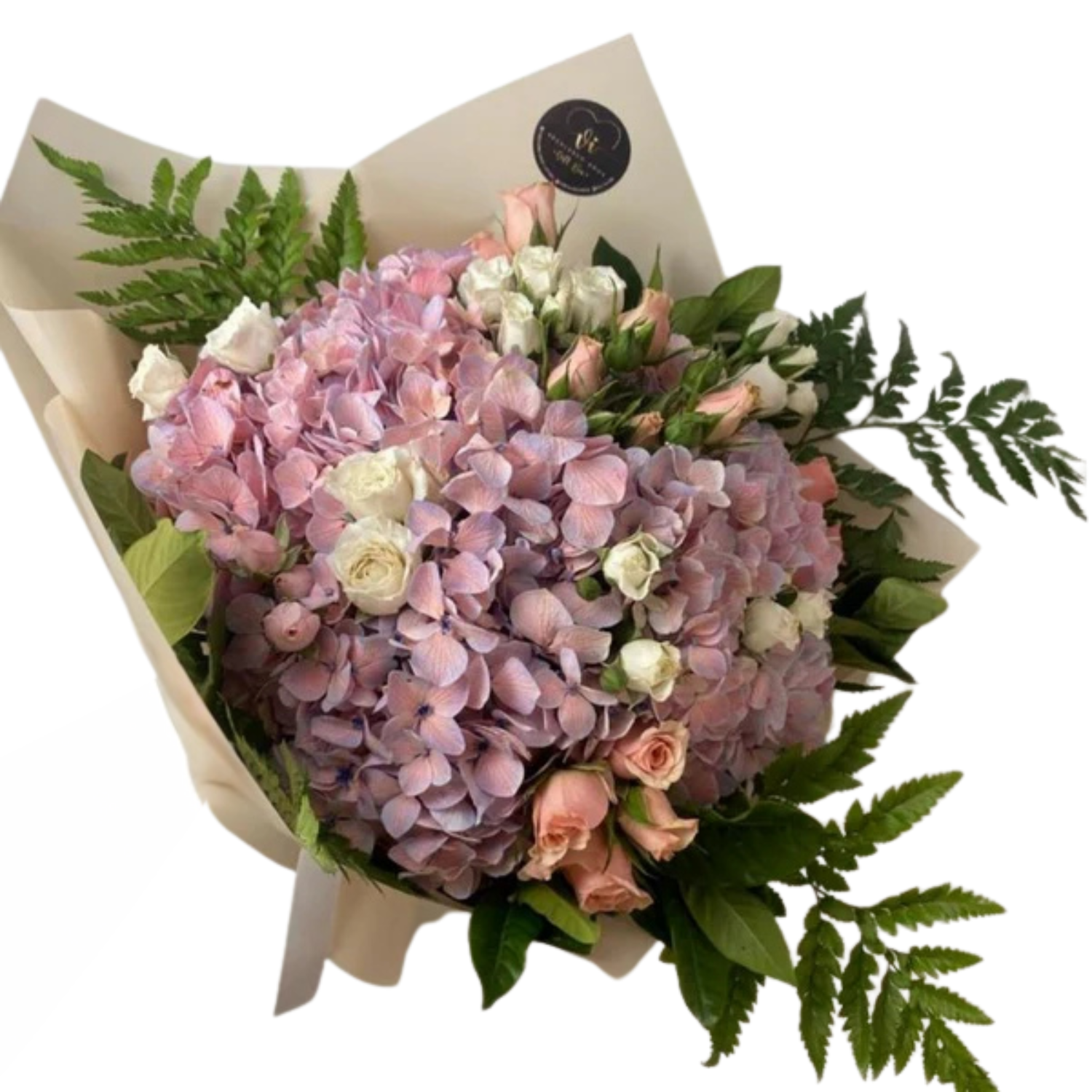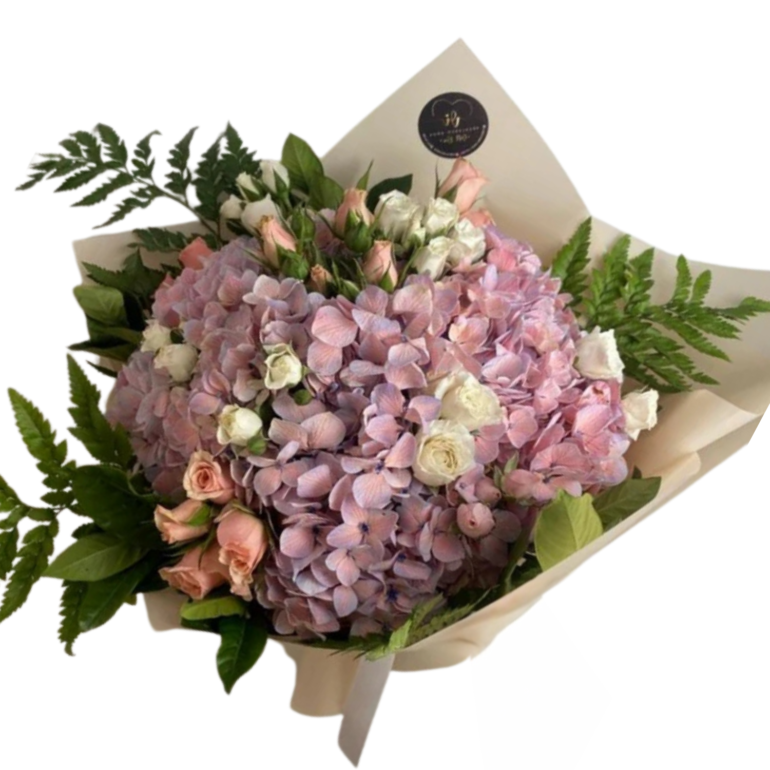 Sumérgete en la serenidad de nuestro 'Ramo Rosaura'. La hortensia, con sus exuberantes y suaves pétalos, se entrelaza armoniosamente con las delicadas mini rosas, creando un conjunto que destila elegancia y frescura.