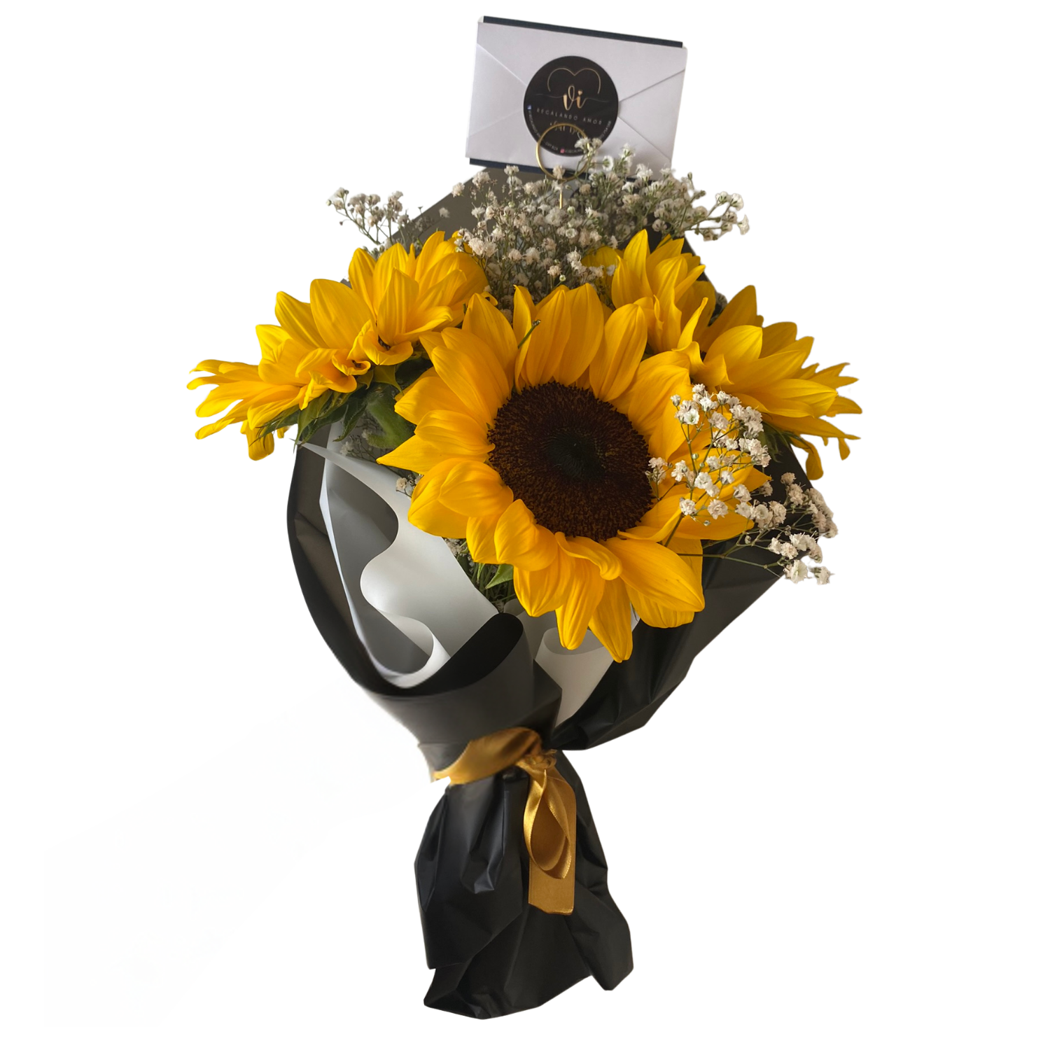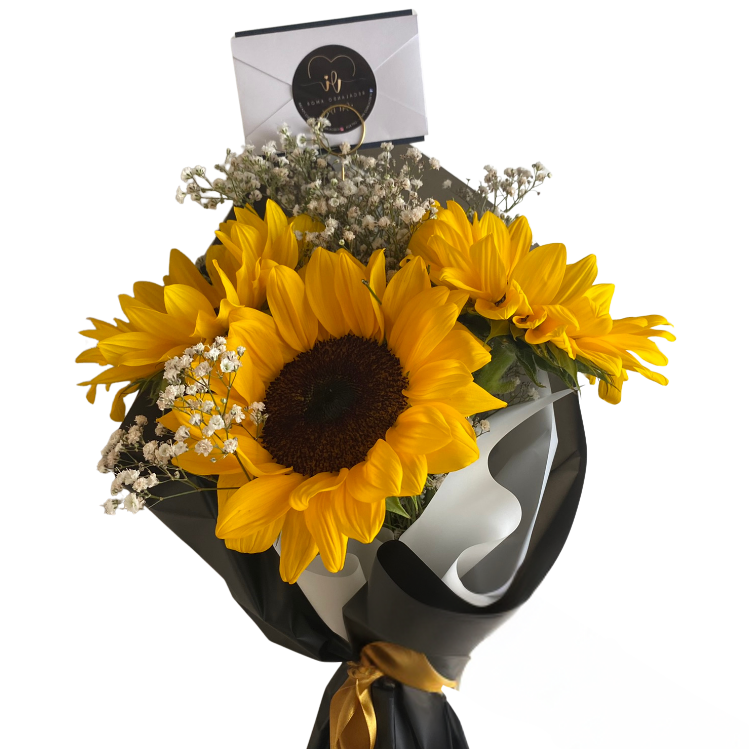 El Ramo Soñar es un reflejo de alegría y luminosidad con tres girasoles y destellos de flores blancas.