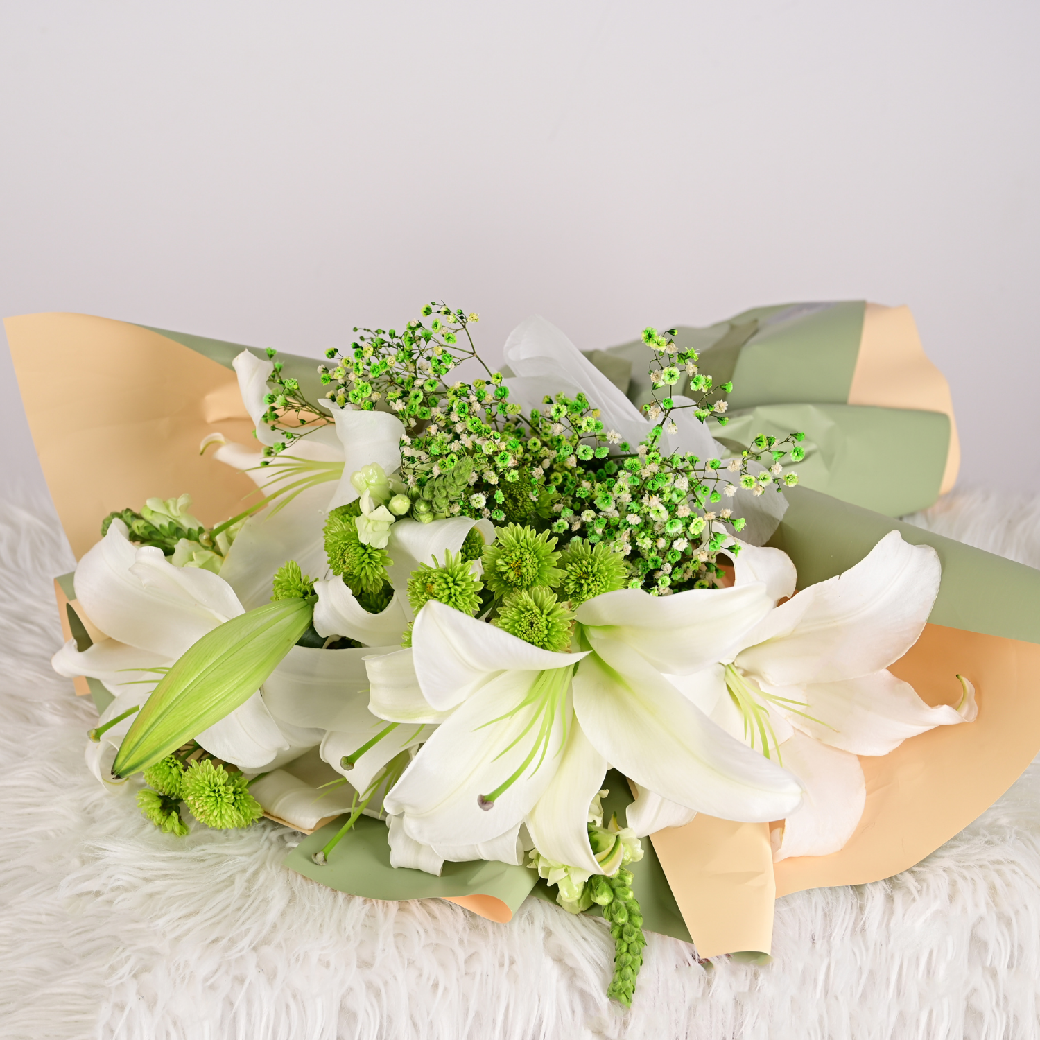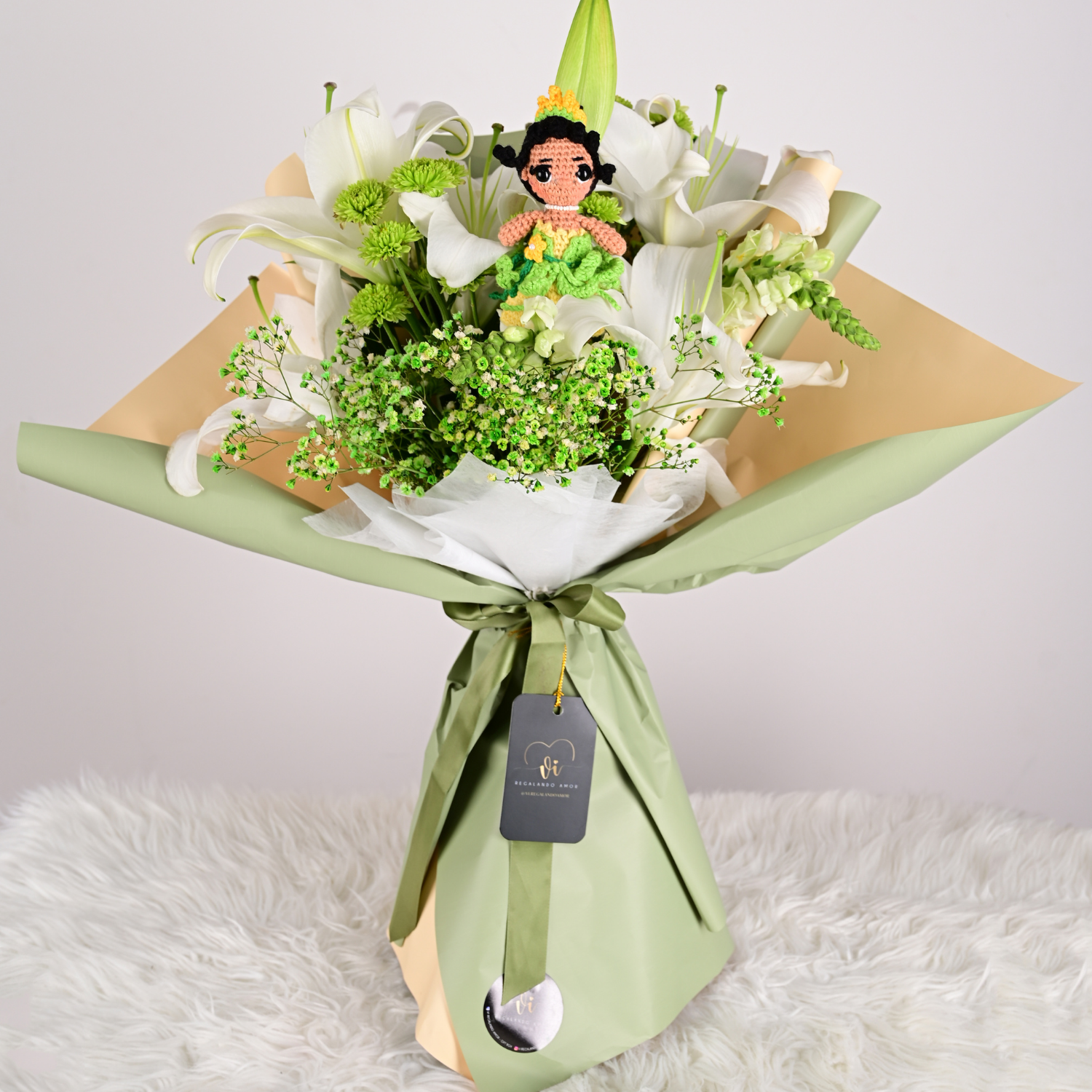 Un arreglo floral elegante y lleno de significado, compuesto por lirios blancos y variedad floral en tonos neutros, que transmiten pureza, serenidad y estilo. Incluye un amigurumi inspirado en la Princesa Tiana, símbolo de perseverancia, sueños y éxito. Perfecto para un regalo sofisticado y memorable.