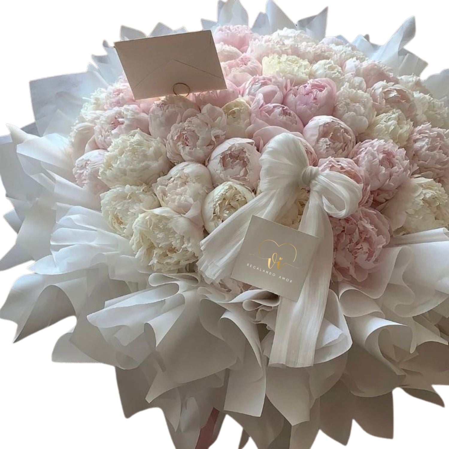 Un arreglo extraordinario compuesto por 60 peonías en una combinación armónica de tonos rosados y blancos, creando un diseño elegante, voluminoso y lleno de presencia. Perfecto para celebrar momentos especiales con un detalle de alto impacto visual y gran sofisticación.