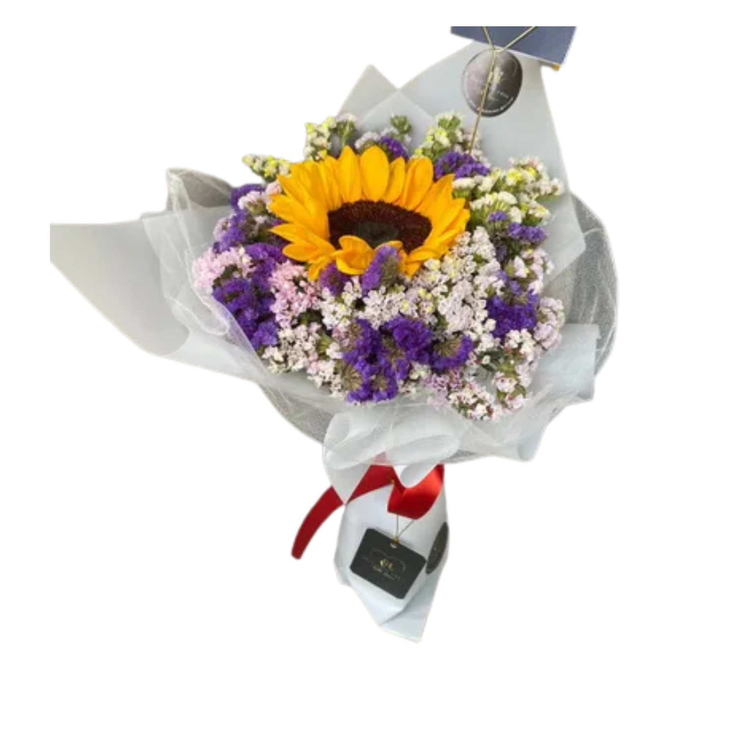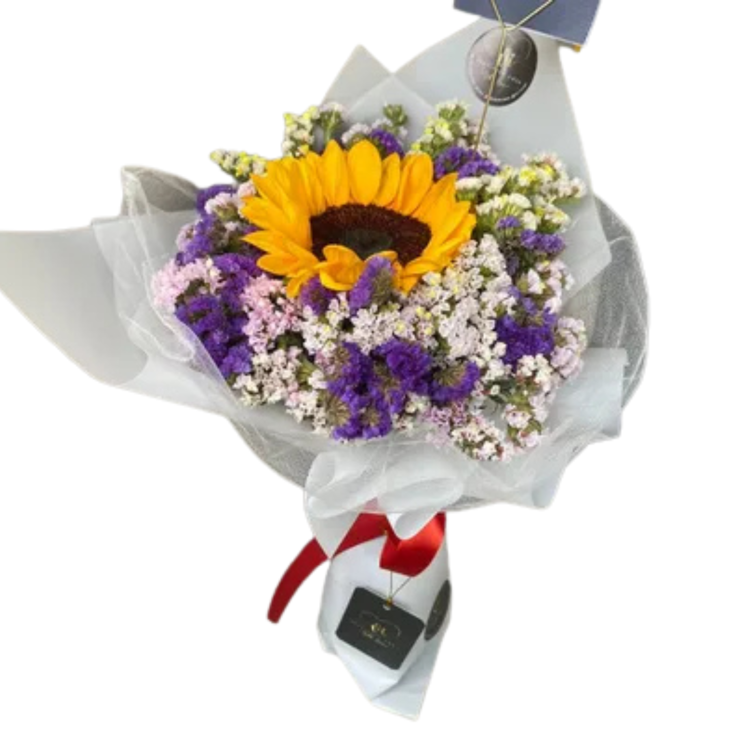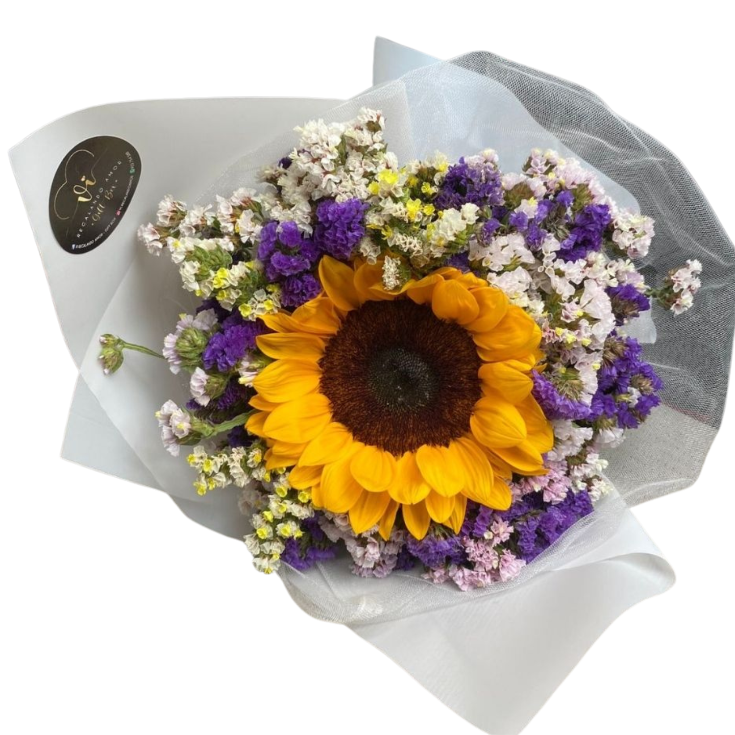Este cautivador ramo presenta la brillante vitalidad de un girasol en el centro, rodeado por la delicada elegancia de la flor estática en una paleta de colores vibrantes.